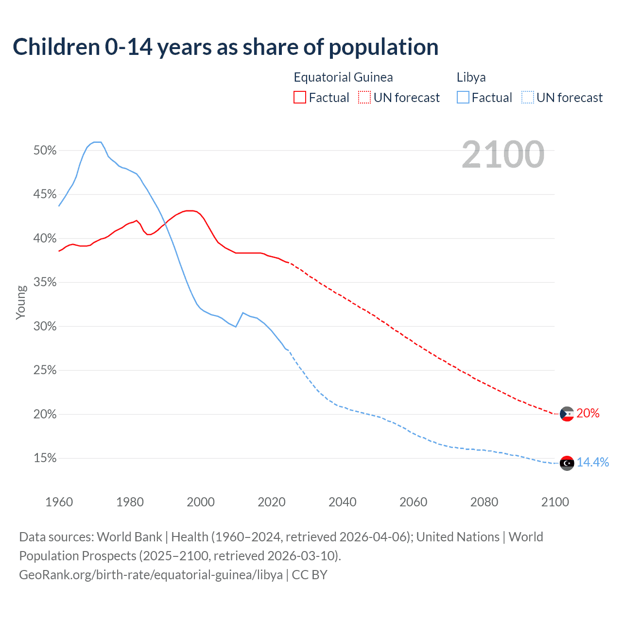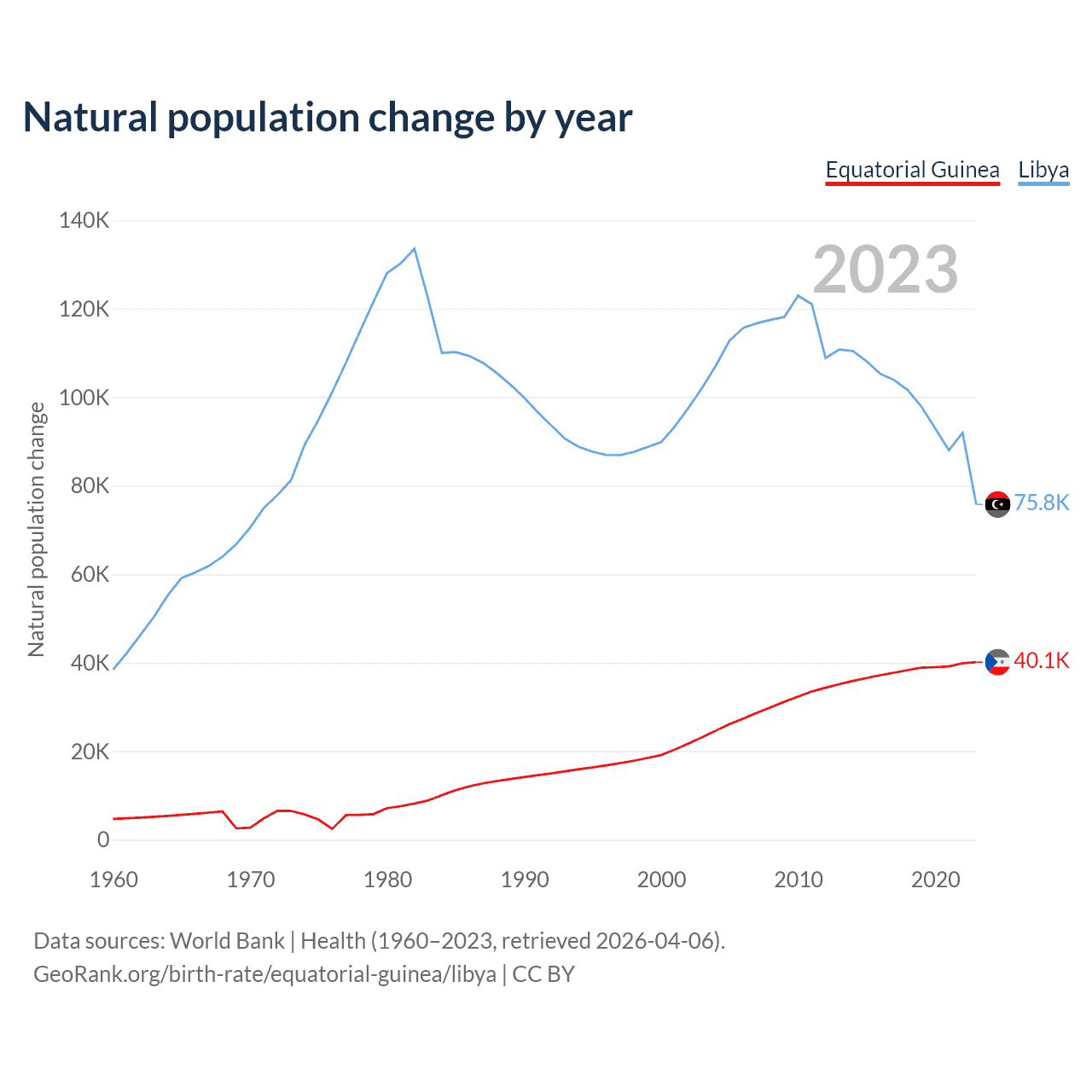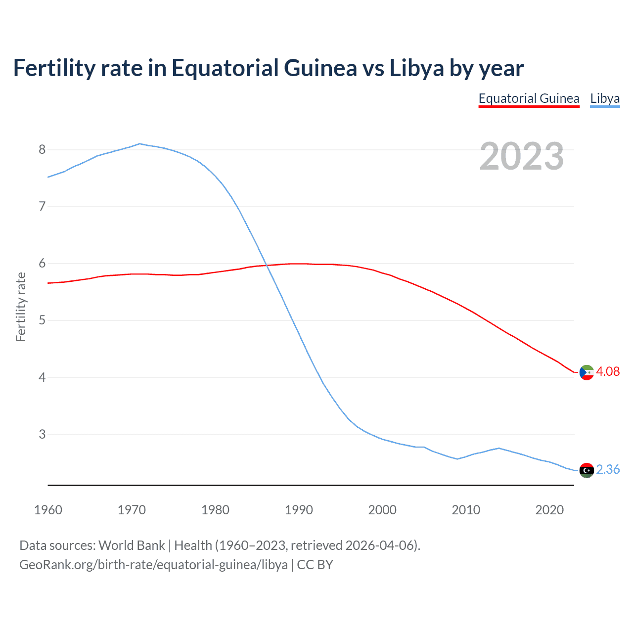 According to the latest available data on birth rates, the fertility rate in Equatorial Guinea was 4.08 children per woman in 2023, compared to 2.36 in Libya in 2023. The replacement level is considered to be 2.1 children per woman.