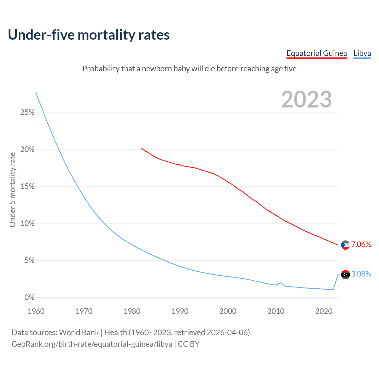 The chance that a newborn baby will die before reaching age five is 7.06% in Equatorial Guinea and 3.08% in Libya. Above is a chart with historical data on under-five mortality rates.