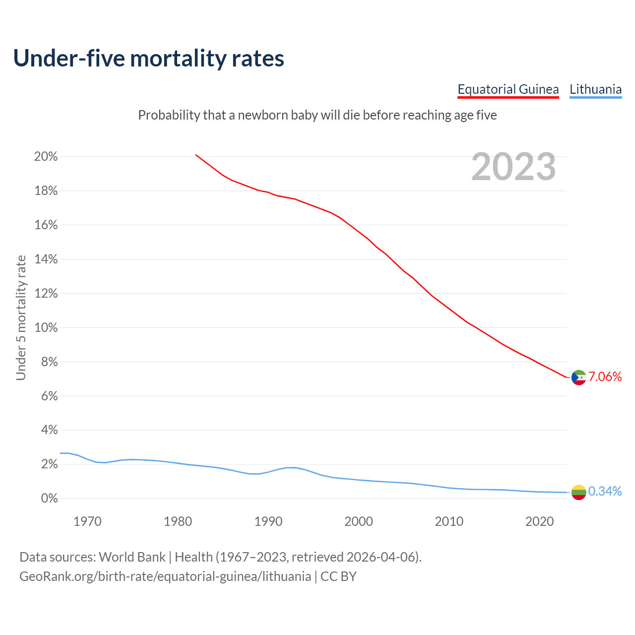 The chance that a newborn baby will die before reaching age five is 7.06% in Equatorial Guinea and 0.34% in Lithuania. Above is a chart with historical data on under-five mortality rates.