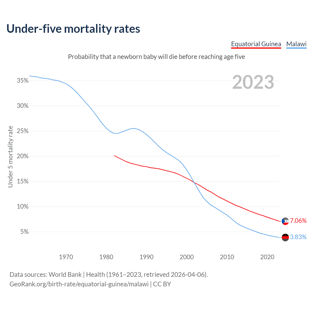 The chance that a newborn baby will die before reaching age five is 7.06% in Equatorial Guinea and 3.83% in Malawi. Above is a chart with historical data on under-five mortality rates.