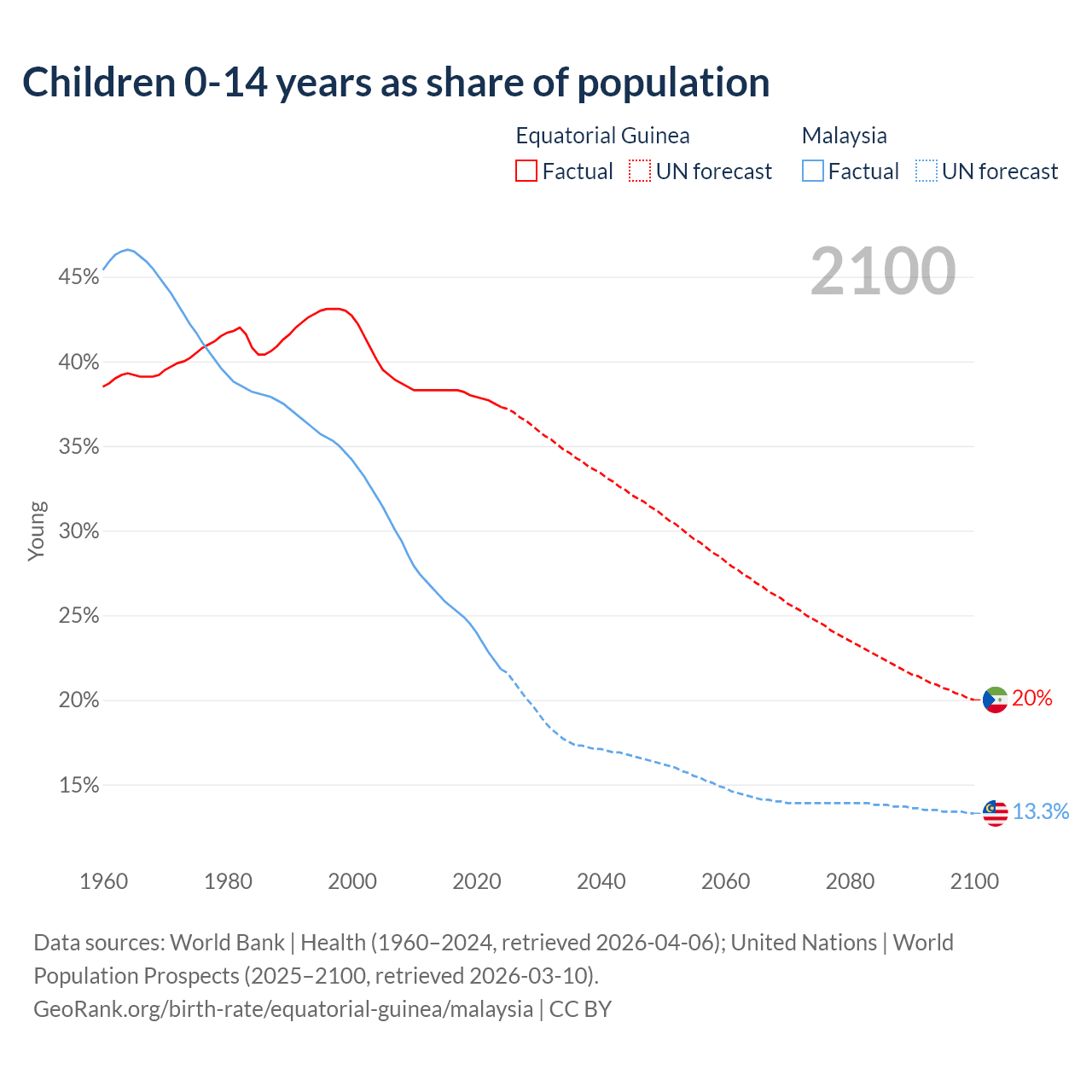 According to the latest available data on birth rates, the fertility rate in Equatorial Guinea was 4.08 children per woman in 2023, compared to 1.55 in Malaysia in 2023. The replacement level is considered to be 2.1 children per woman.