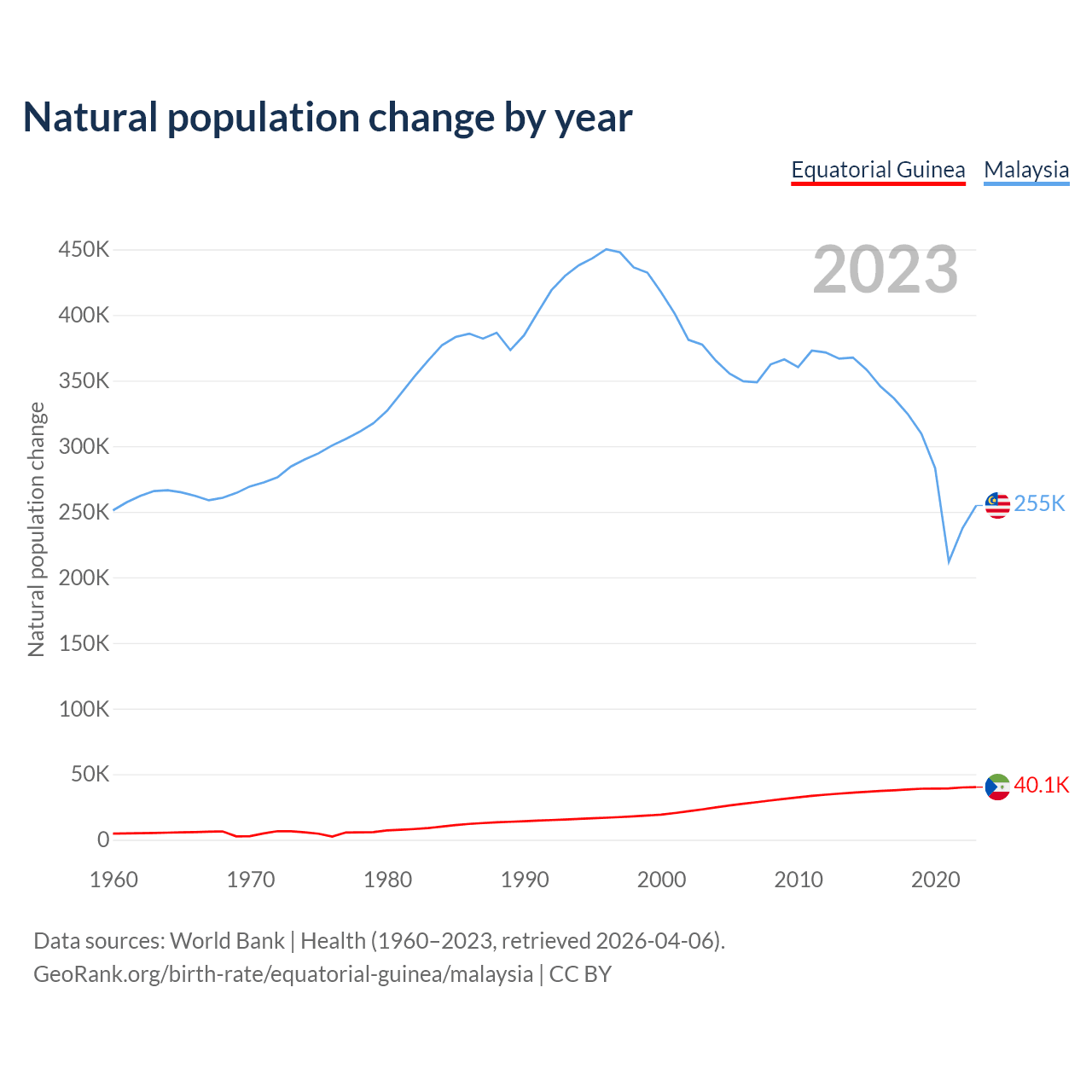 Equatorial Guinea has an annual birth rate of 29.6 births per 1,000 people, compared to 12.4 for Malaysia. The average number of children a woman is expected to have during her lifetime — the fertility rate, is 4.08 in Equatorial Guinea and 1.55 in Malaysia — 62% difference.