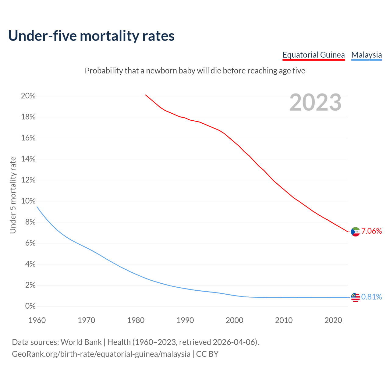 The chance that a newborn baby will die before reaching age five is 7.06% in Equatorial Guinea and 0.81% in Malaysia. Above is a chart with historical data on under-five mortality rates.
