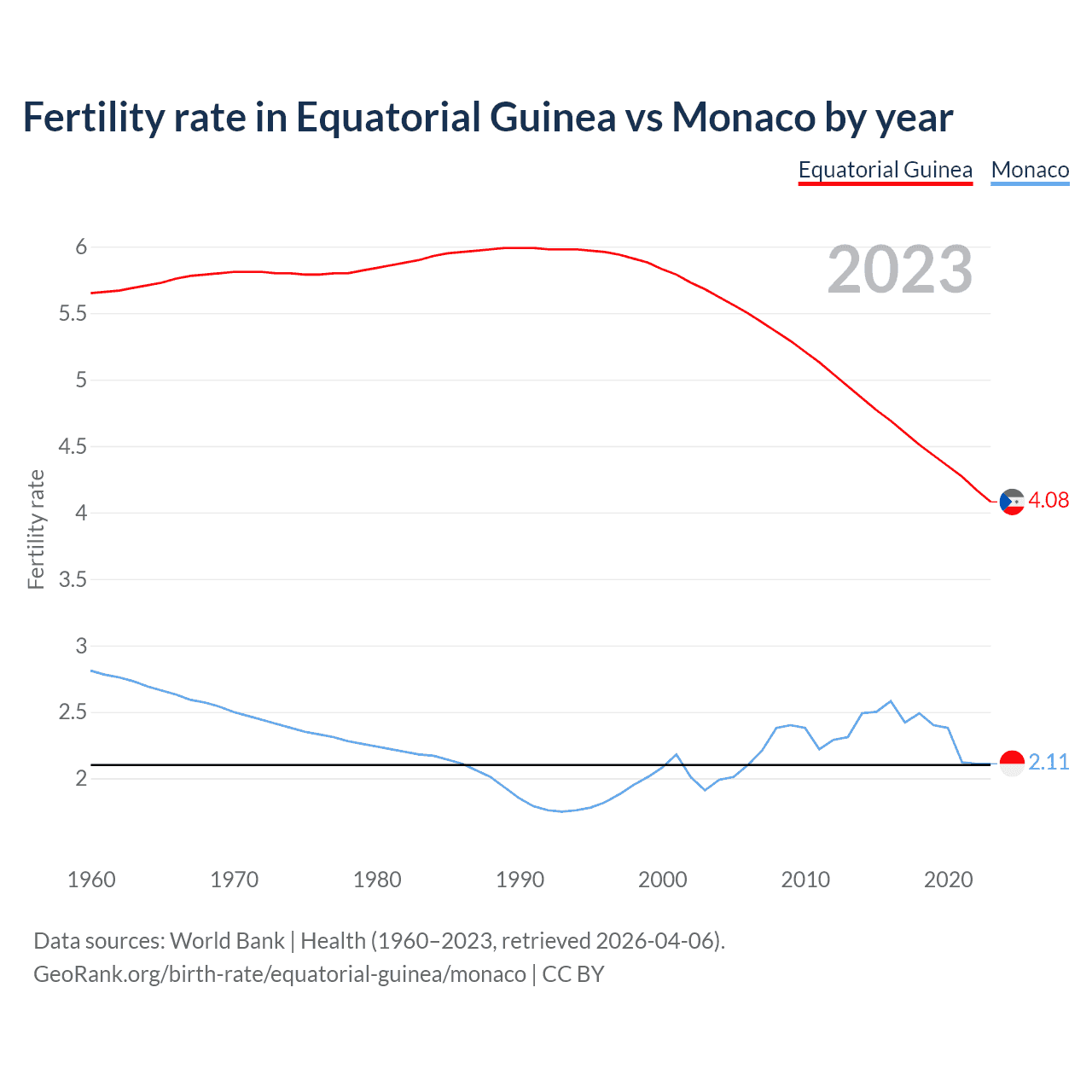 According to the latest available data on birth rates, the fertility rate in Equatorial Guinea was 4.08 children per woman in 2023, compared to 2.11 in Monaco in 2023. The replacement level is considered to be 2.1 children per woman.