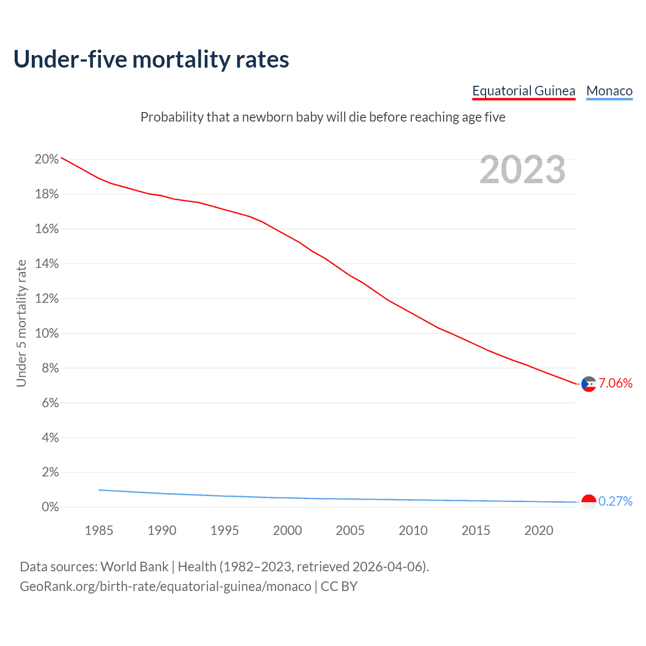 The chance that a newborn baby will die before reaching age five is 7.06% in Equatorial Guinea and 0.27% in Monaco. Above is a chart with historical data on under-five mortality rates.