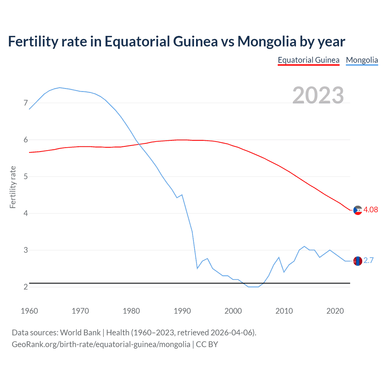 1960 vs 2023, the fertility rate has decreased by 27.8% in Equatorial Guinea and by 60.4% in Mongolia — in 1960, it was 5.65 and 6.82, respectively.