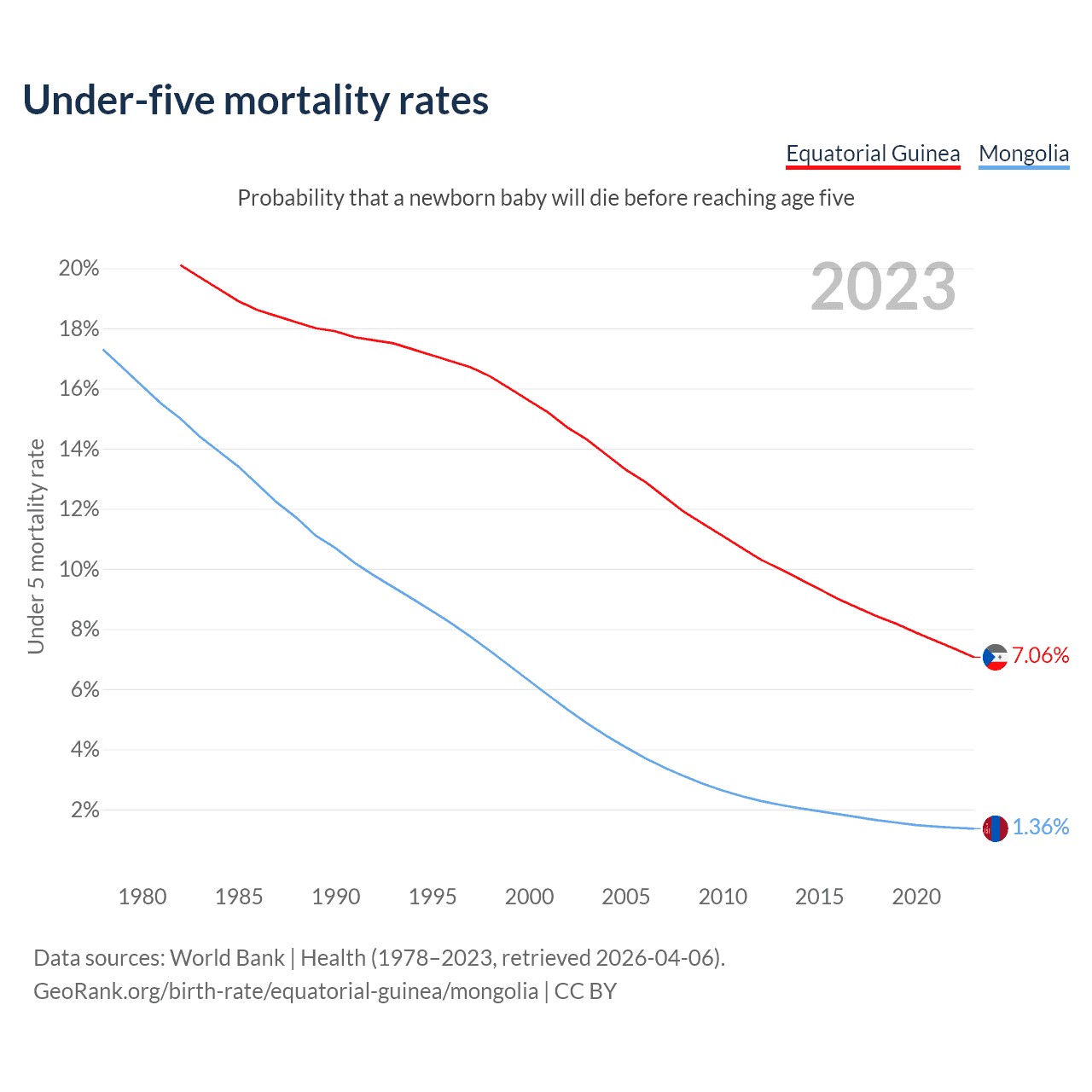 The chance that a newborn baby will die before reaching age five is 7.06% in Equatorial Guinea and 1.36% in Mongolia. Above is a chart with historical data on under-five mortality rates.