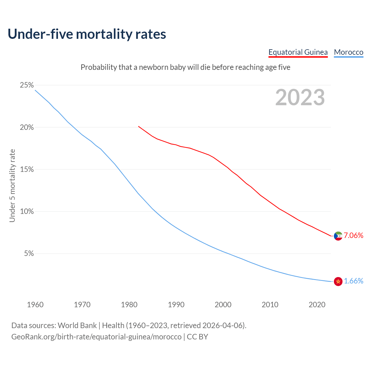 The chance that a newborn baby will die before reaching age five is 7.06% in Equatorial Guinea and 1.66% in Morocco. Above is a chart with historical data on under-five mortality rates.