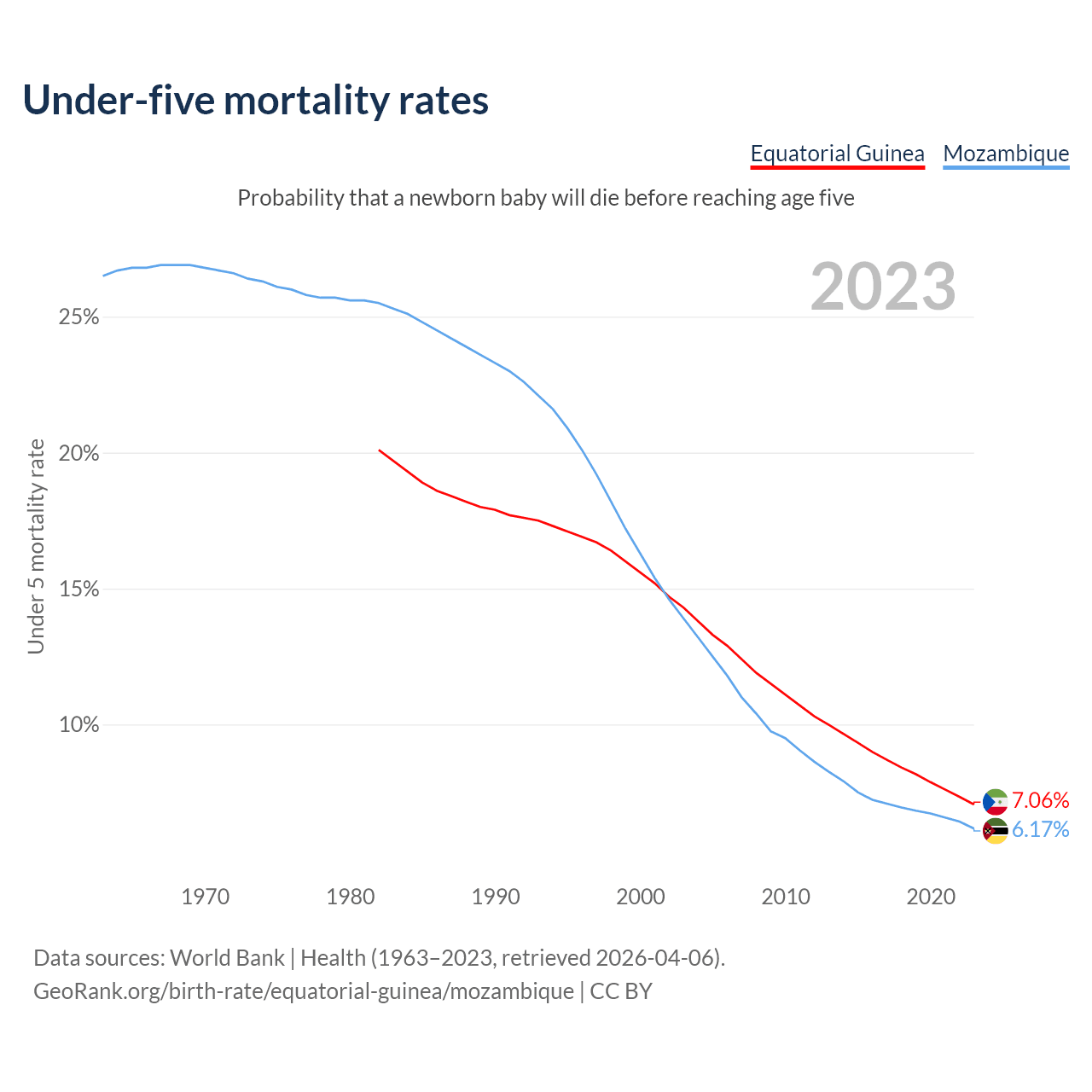 The chance that a newborn baby will die before reaching age five is 7.06% in Equatorial Guinea and 6.17% in Mozambique. Above is a chart with historical data on under-five mortality rates.