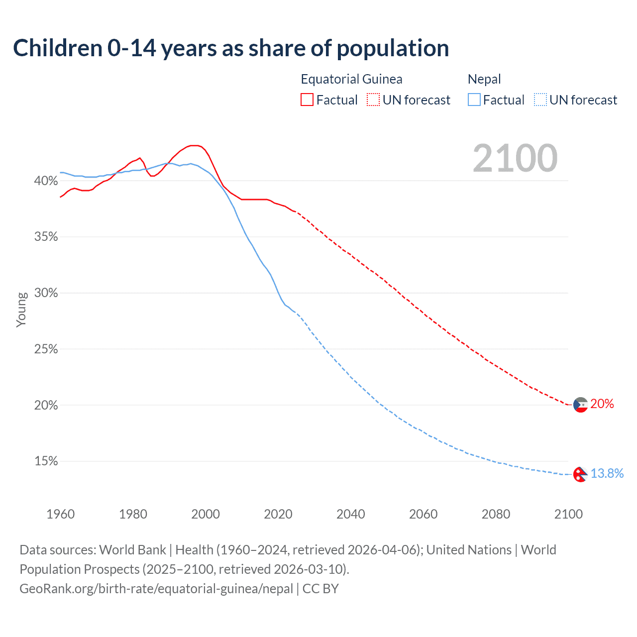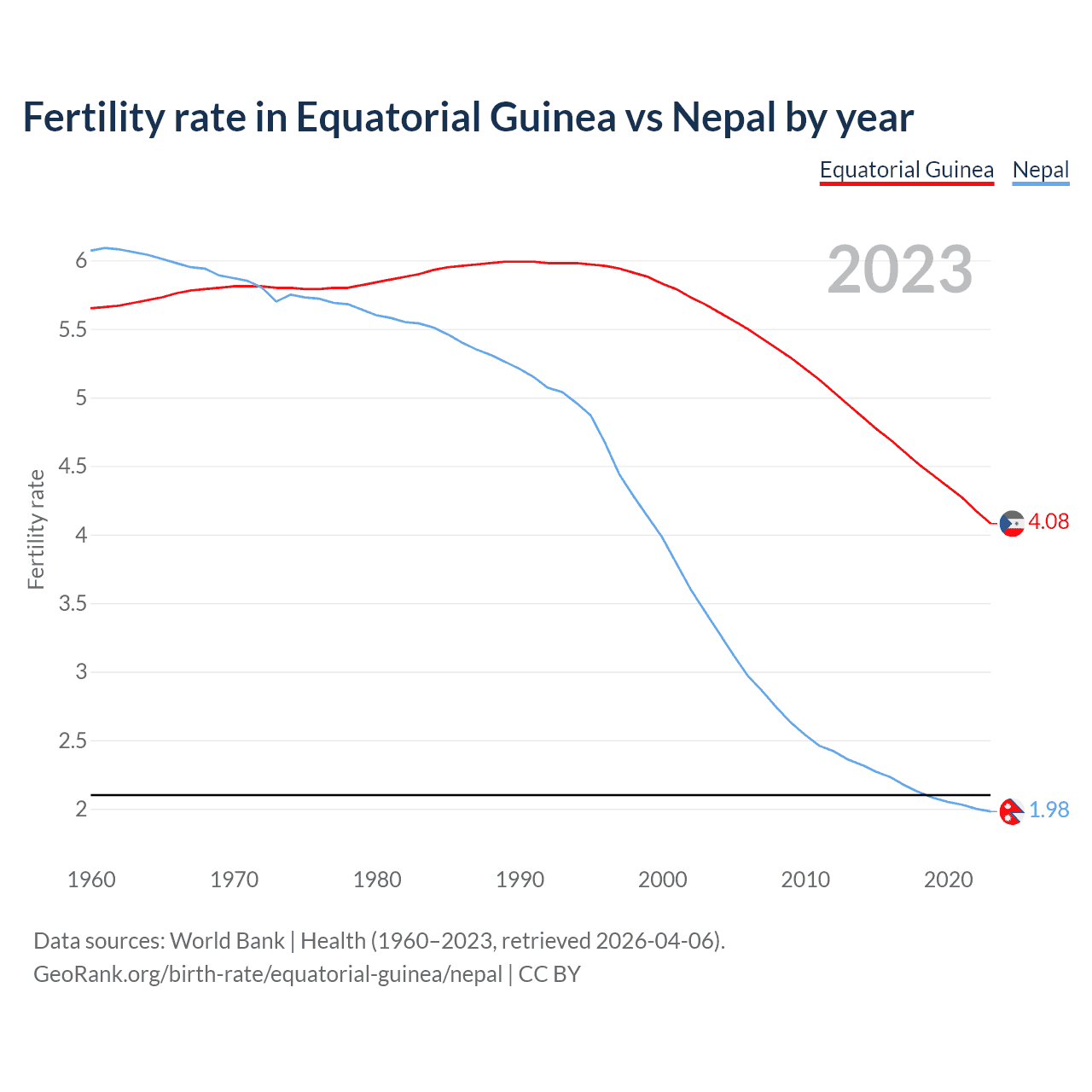 According to the latest available data on birth rates, the fertility rate in Equatorial Guinea was 4.08 children per woman in 2023, compared to 1.98 in Nepal in 2023. The replacement level is considered to be 2.1 children per woman.