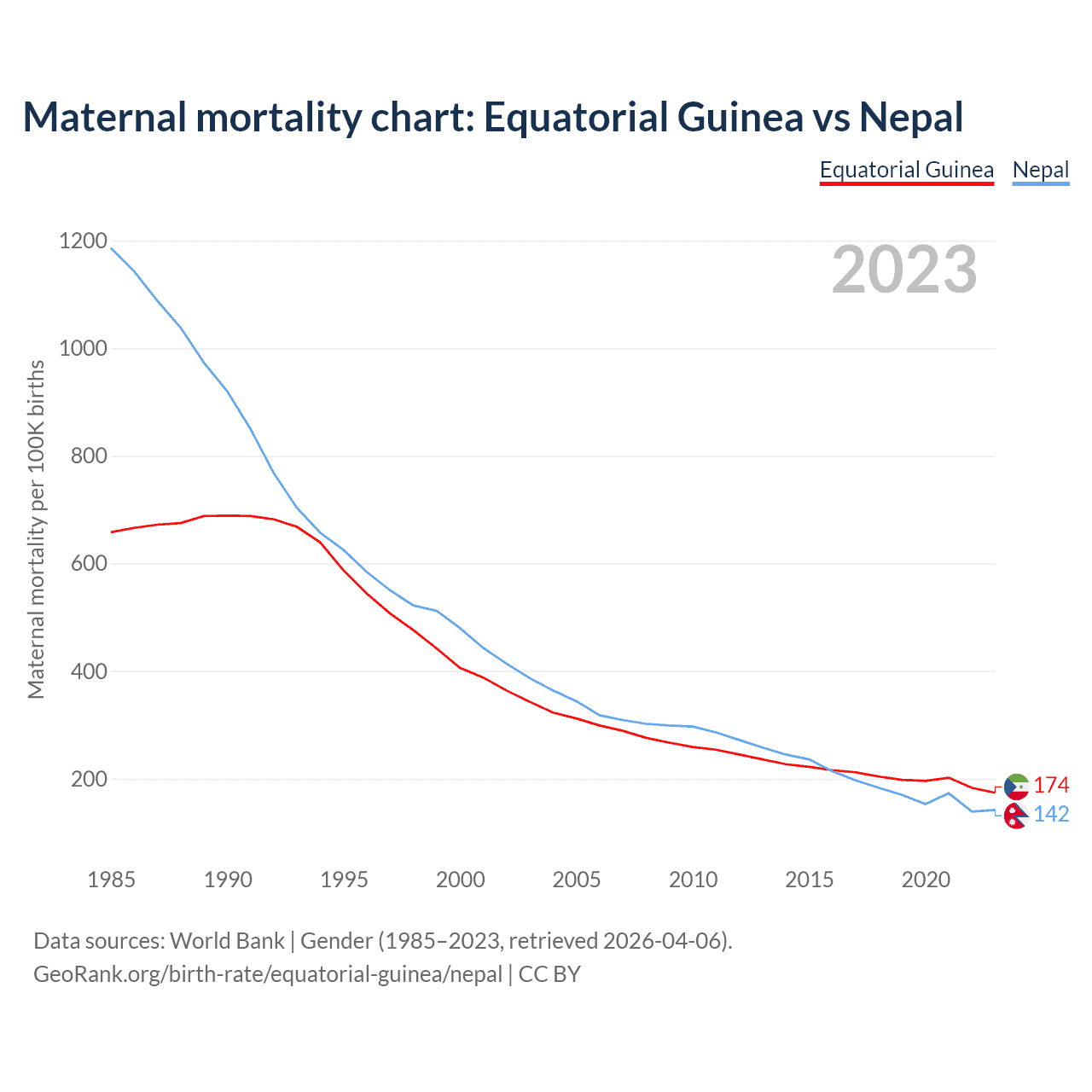 The maternal mortality rate, which is the probability of dying during childbirth or within 42 days of pregnancy termination, is 174 deaths per 100,000 live births in Equatorial Guinea, compared to 142 deaths in Nepal.