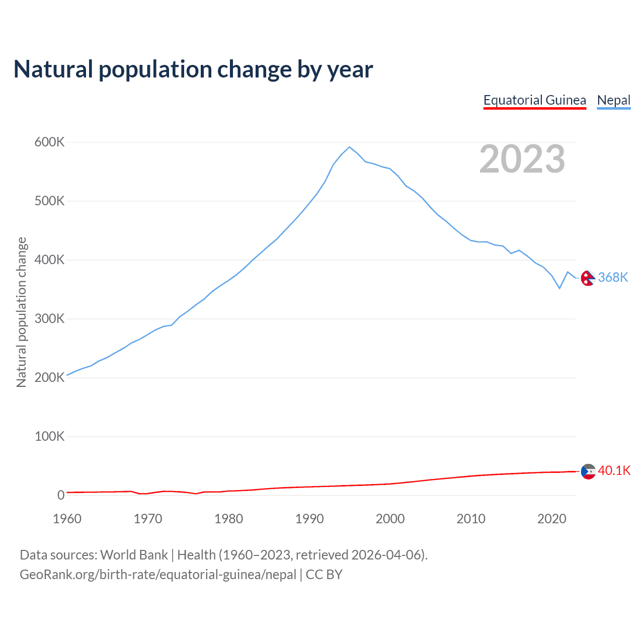 Equatorial Guinea has an annual birth rate of 29.6 births per 1,000 people, compared to 19.3 for Nepal. The average number of children a woman is expected to have during her lifetime — the fertility rate, is 4.08 in Equatorial Guinea and 1.98 in Nepal — 51.4% difference.