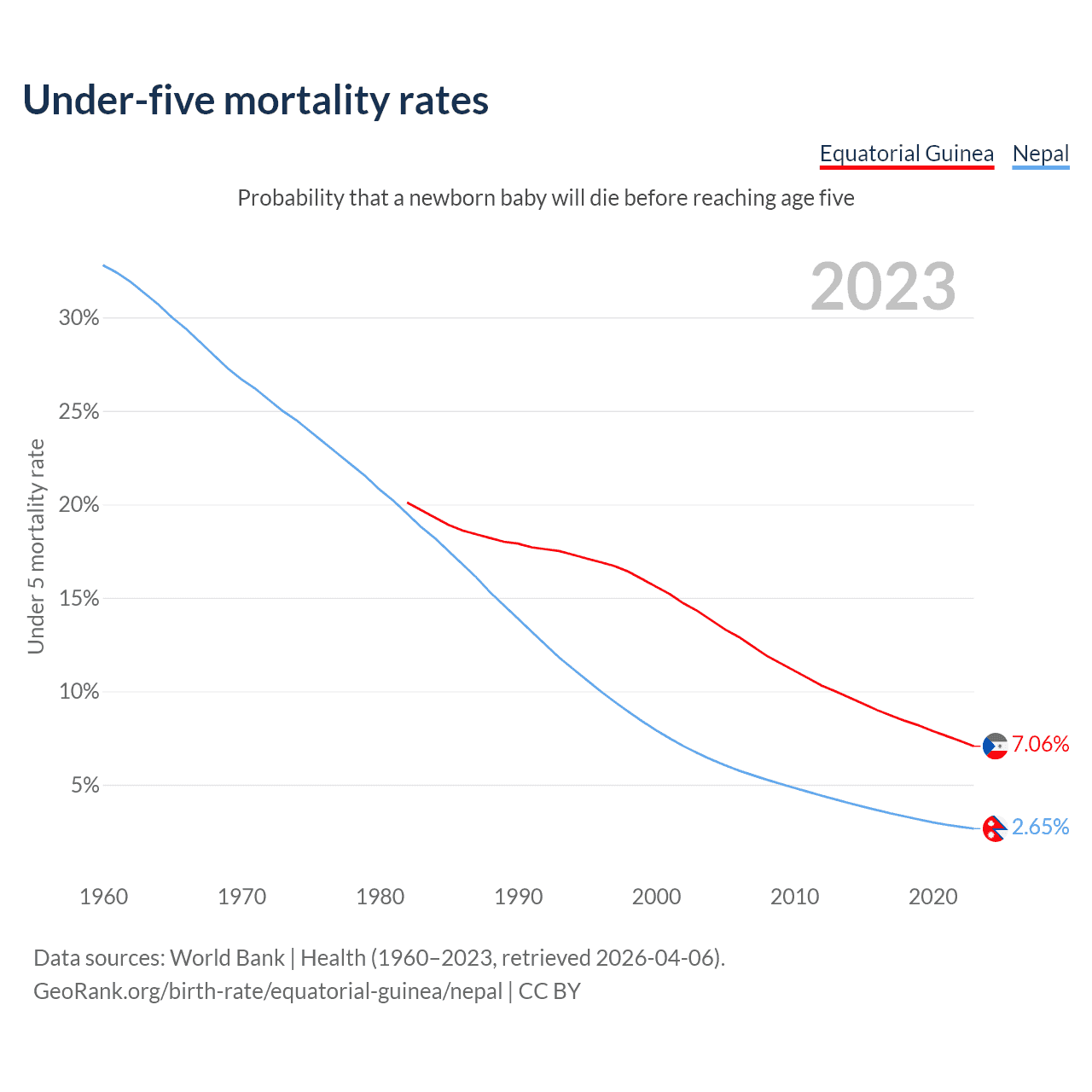 The chance that a newborn baby will die before reaching age five is 7.06% in Equatorial Guinea and 2.65% in Nepal. Above is a chart with historical data on under-five mortality rates.