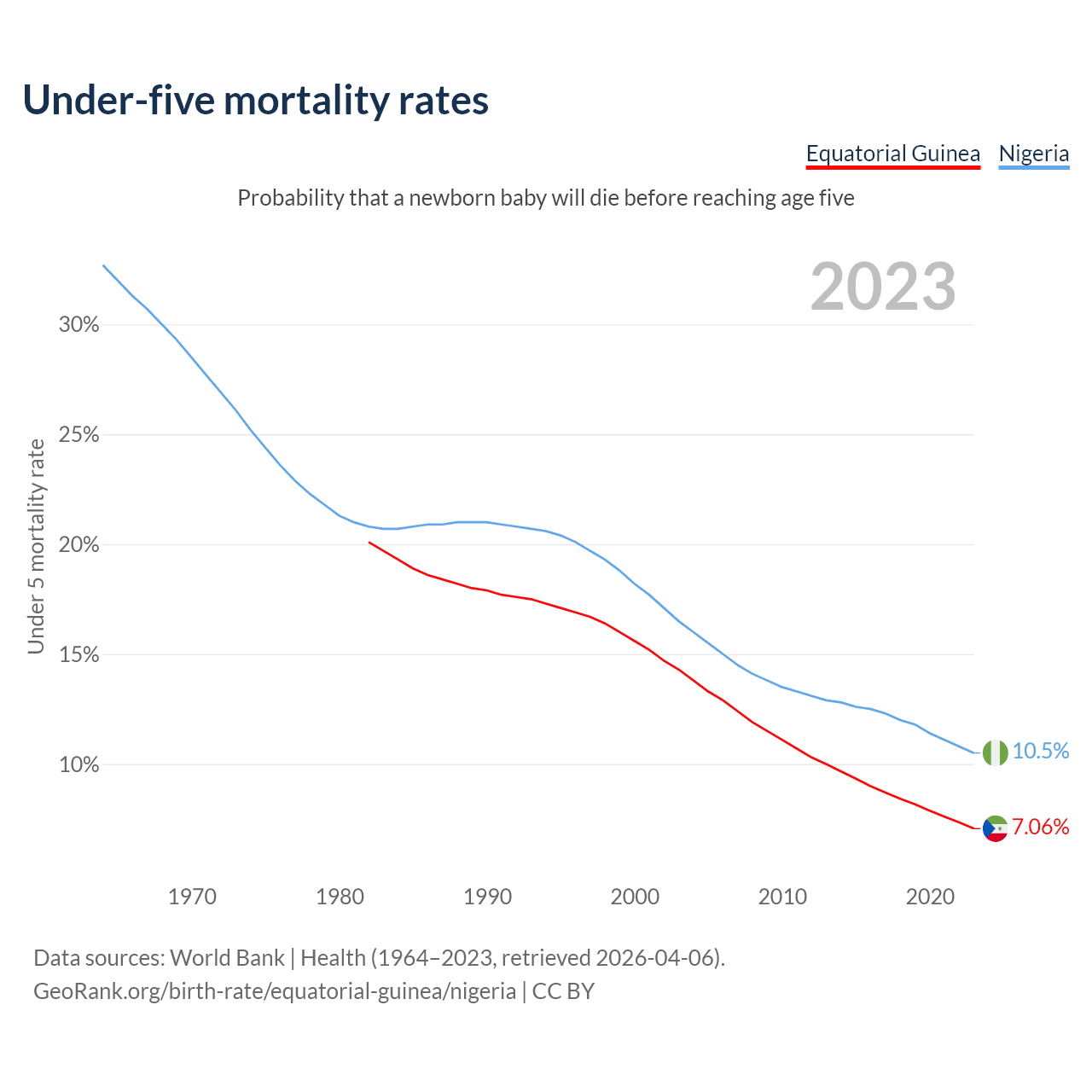 The chance that a newborn baby will die before reaching age five is 7.06% in Equatorial Guinea and 10.5% in Nigeria. Above is a chart with historical data on under-five mortality rates.