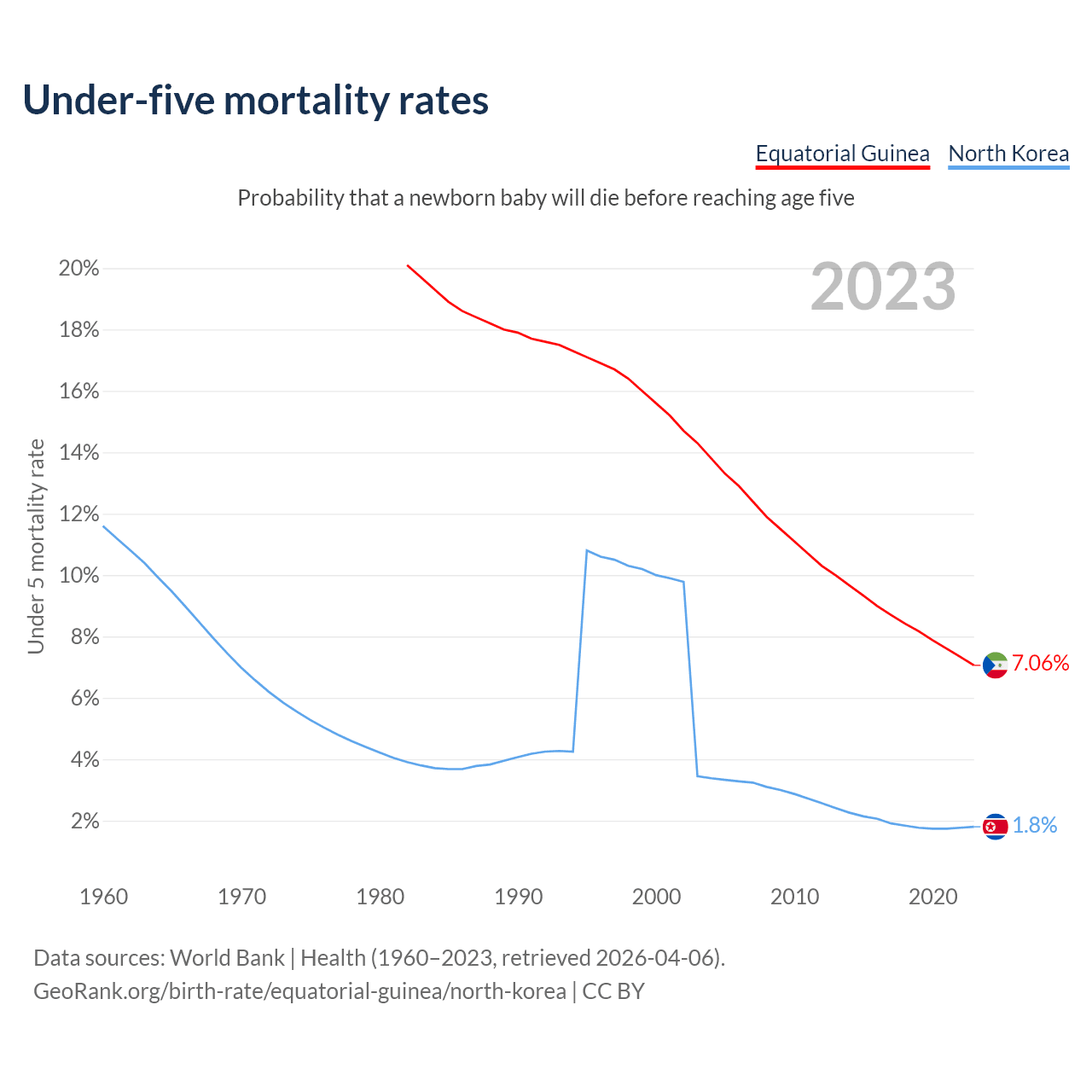 The chance that a newborn baby will die before reaching age five is 7.06% in Equatorial Guinea and 1.8% in North Korea. Above is a chart with historical data on under-five mortality rates.