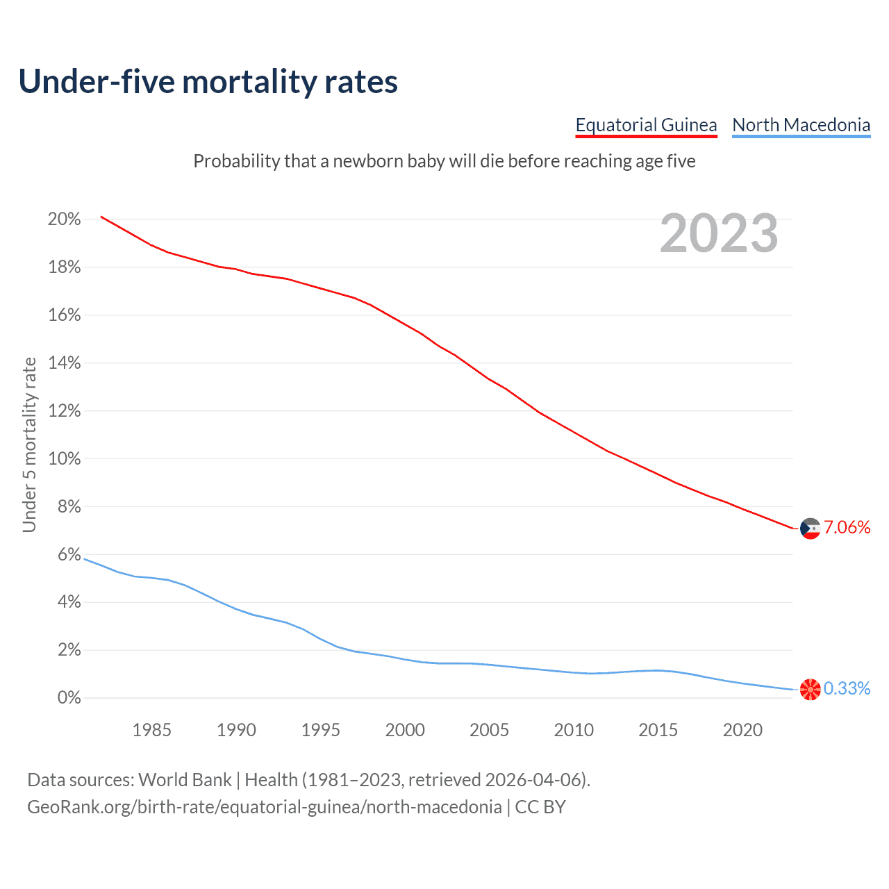 The chance that a newborn baby will die before reaching age five is 7.06% in Equatorial Guinea and 0.33% in North Macedonia. Above is a chart with historical data on under-five mortality rates.