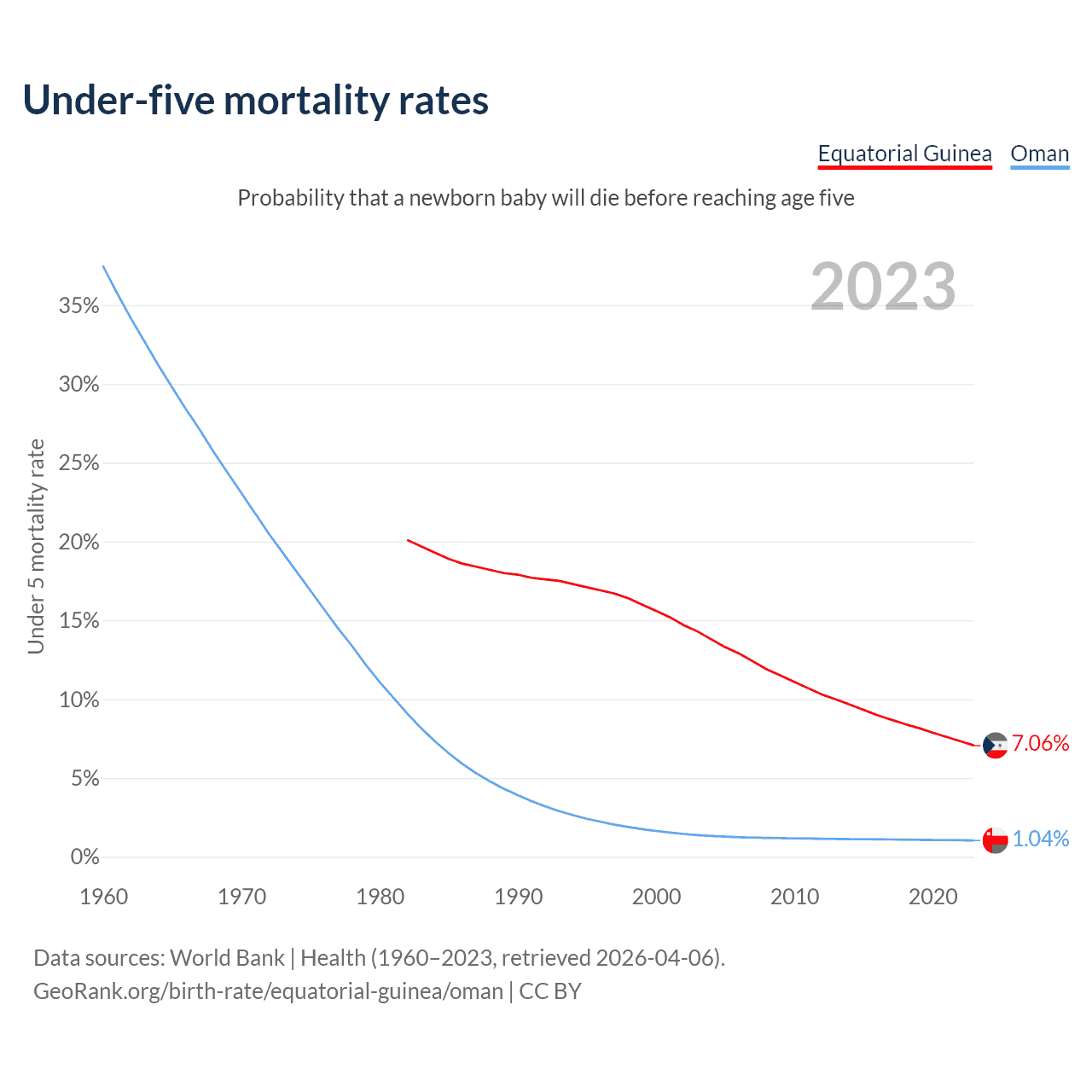 The chance that a newborn baby will die before reaching age five is 7.06% in Equatorial Guinea and 1.04% in Oman. Above is a chart with historical data on under-five mortality rates.