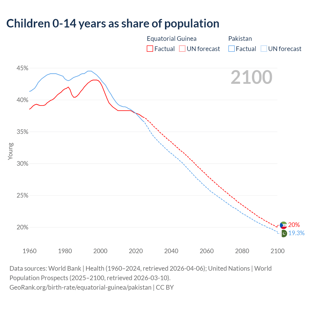 According to the latest available data on birth rates, the fertility rate in Equatorial Guinea was 4.08 children per woman in 2023, compared to 3.61 in Pakistan in 2023. The replacement level is considered to be 2.1 children per woman.