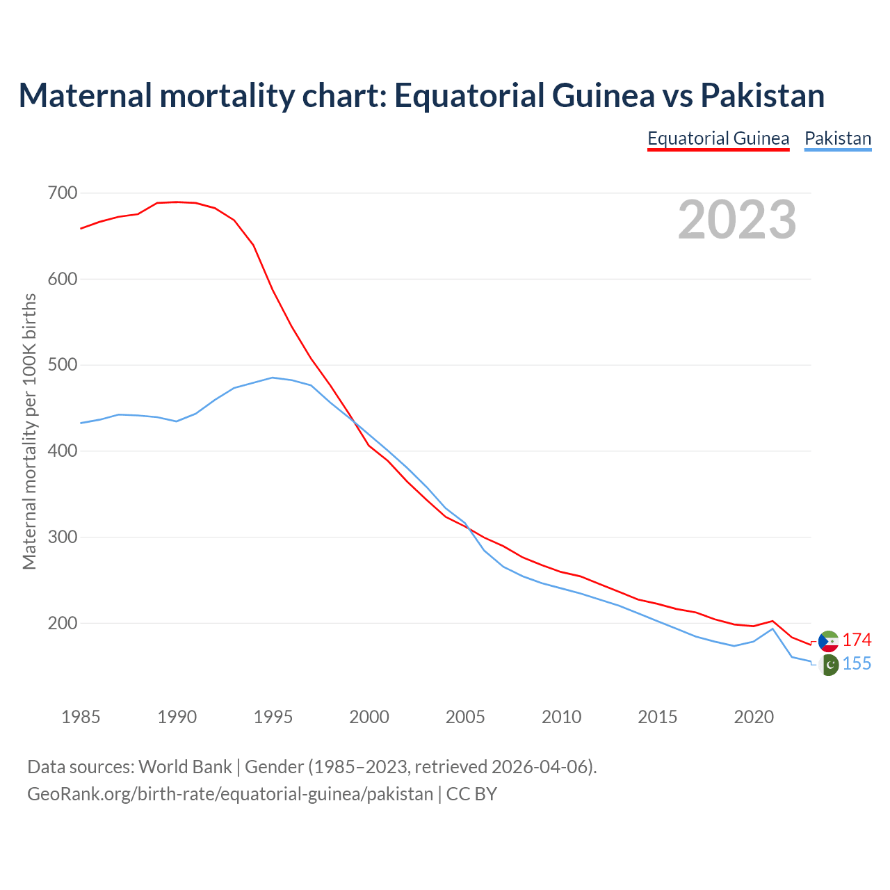 The maternal mortality rate, which is the probability of dying during childbirth or within 42 days of pregnancy termination, is 174 deaths per 100,000 live births in Equatorial Guinea, compared to 155 deaths in Pakistan.