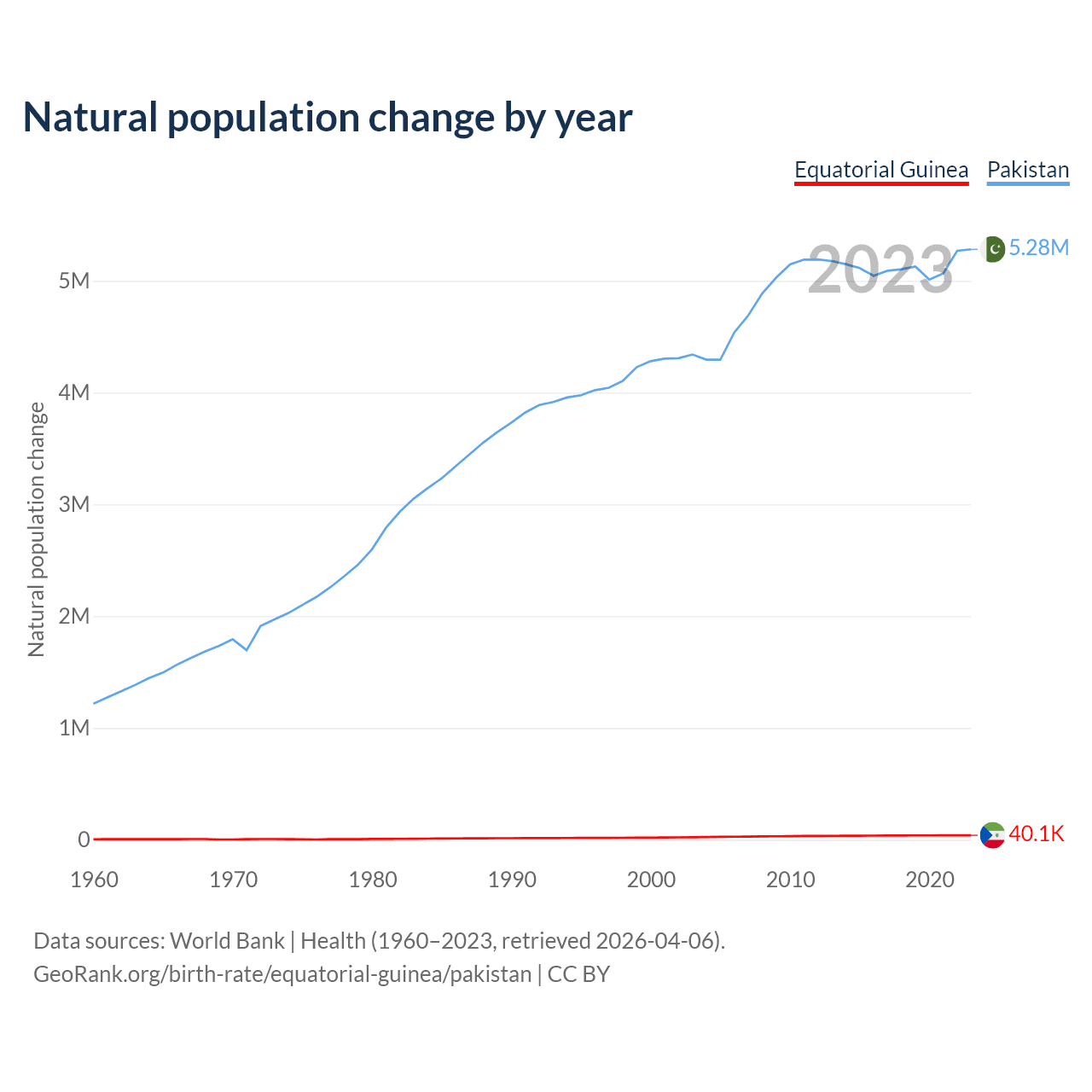 Equatorial Guinea has an annual birth rate of 29.6 births per 1,000 people, compared to 27.8 for Pakistan. The average number of children a woman is expected to have during her lifetime — the fertility rate, is 4.08 in Equatorial Guinea and 3.61 in Pakistan — 11.7% difference.