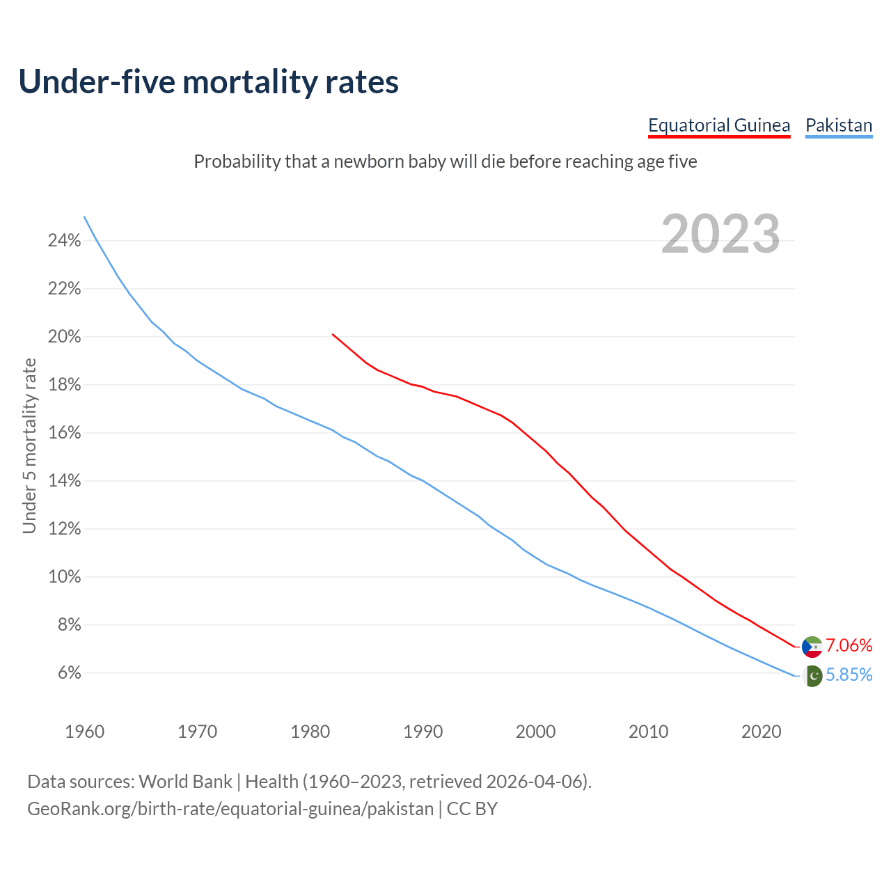 The chance that a newborn baby will die before reaching age five is 7.06% in Equatorial Guinea and 5.85% in Pakistan. Above is a chart with historical data on under-five mortality rates.