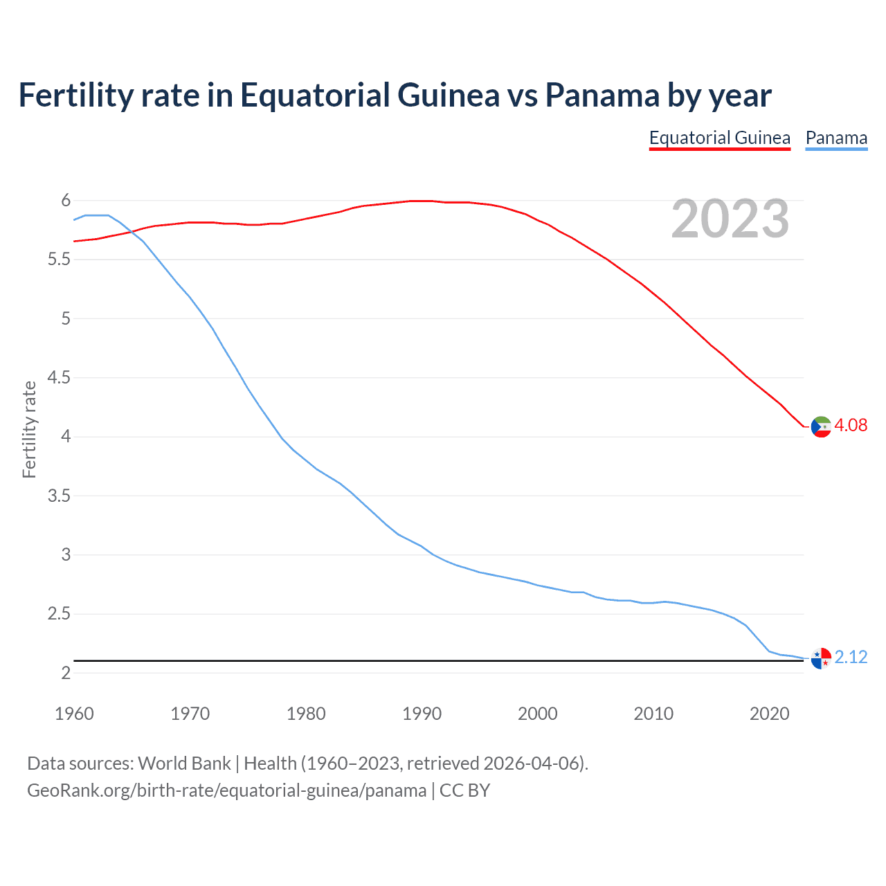 According to the latest available data on birth rates, the fertility rate in Equatorial Guinea was 4.08 children per woman in 2023, compared to 2.12 in Panama in 2023. The replacement level is considered to be 2.1 children per woman.