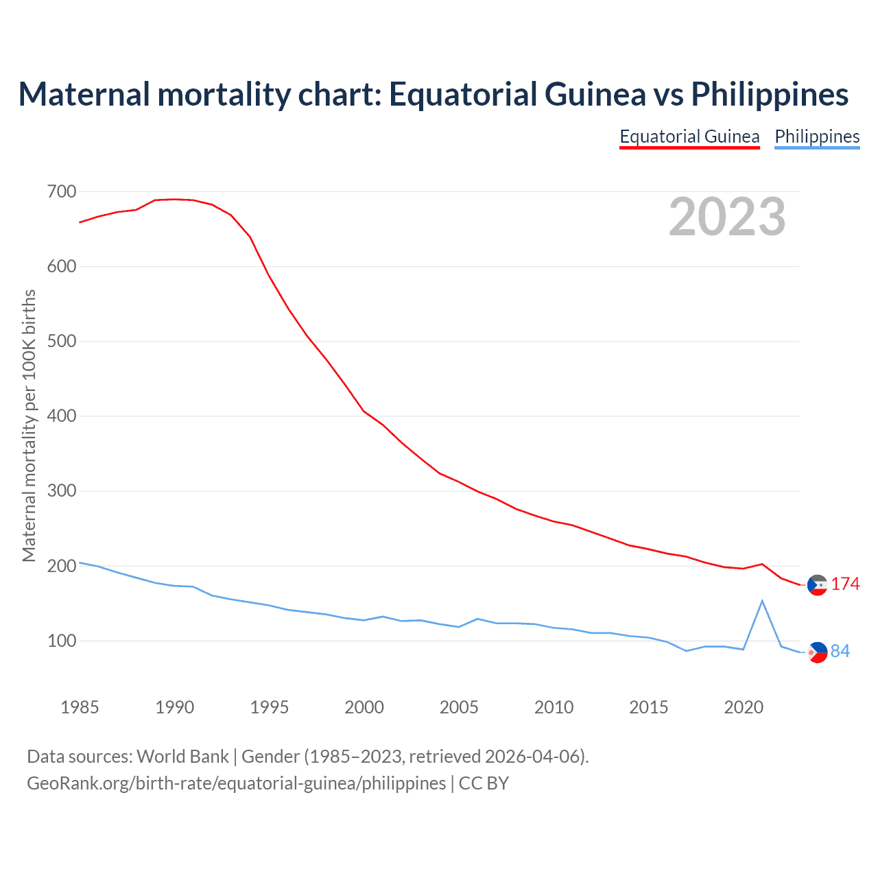 Data sources: World Bank | Gender (1985–2023, retrieved 2026-04-06).