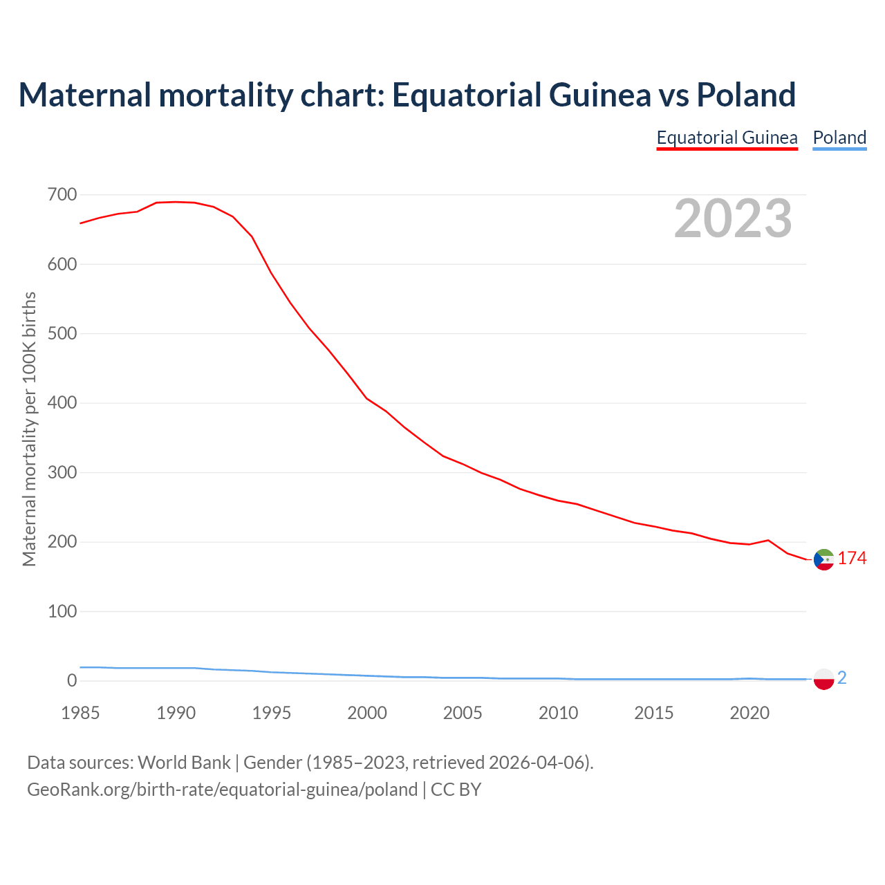 The maternal mortality rate, which is the probability of dying during childbirth or within 42 days of pregnancy termination, is 174 deaths per 100,000 live births in Equatorial Guinea, compared to 2 deaths in Poland.