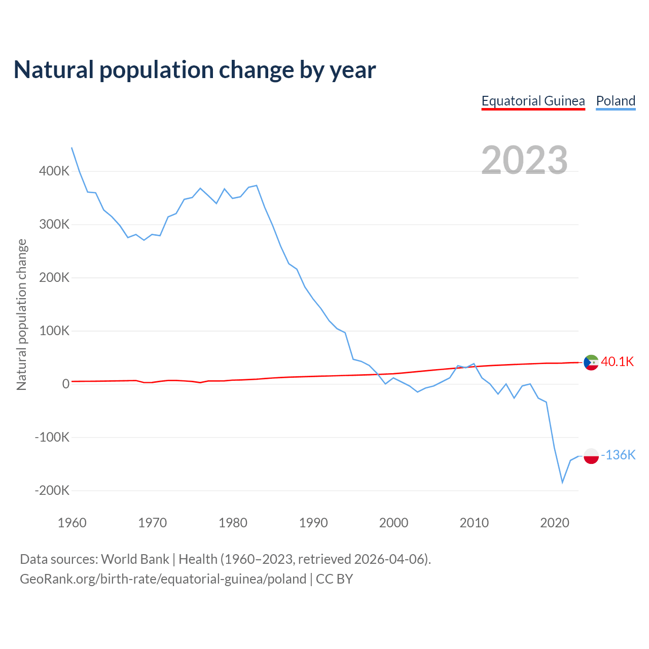 Equatorial Guinea has an annual birth rate of 29.6 births per 1,000 people, compared to 7.4 for Poland. The average number of children a woman is expected to have during her lifetime — the fertility rate, is 4.08 in Equatorial Guinea and 1.16 in Poland — 71.6% difference.