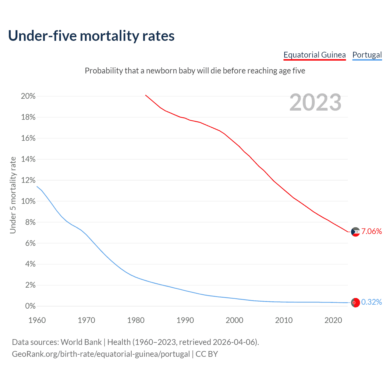The chance that a newborn baby will die before reaching age five is 7.06% in Equatorial Guinea and 0.32% in Portugal. Above is a chart with historical data on under-five mortality rates.