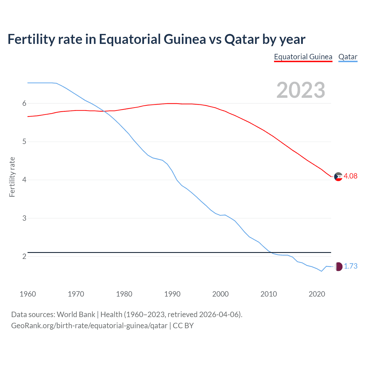 According to the latest available data on birth rates, the fertility rate in Equatorial Guinea was 4.08 children per woman in 2023, compared to 1.73 in Qatar in 2023. The replacement level is considered to be 2.1 children per woman.