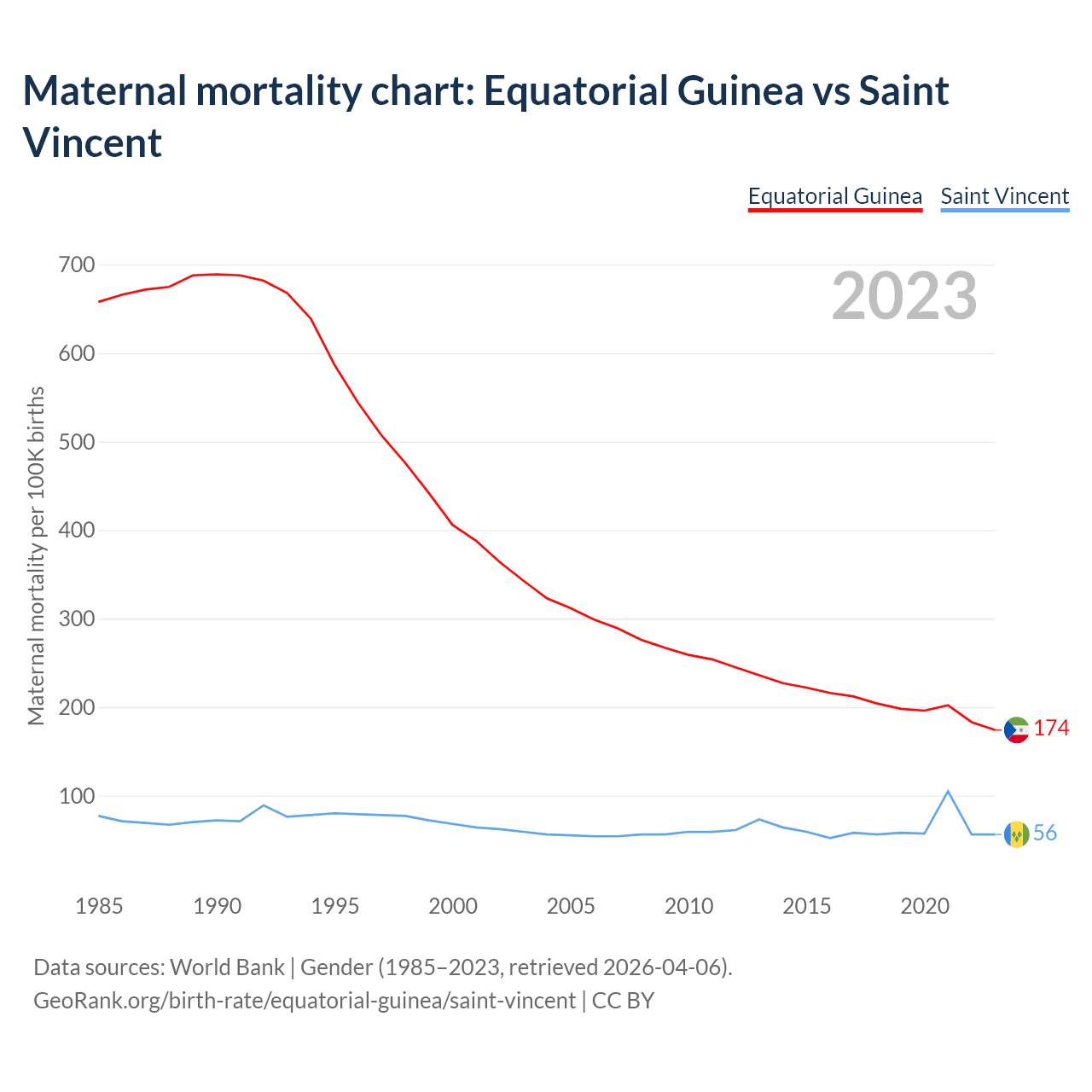 The maternal mortality rate, which is the probability of dying during childbirth or within 42 days of pregnancy termination, is 174 deaths per 100,000 live births in Equatorial Guinea, compared to 56 deaths in Saint Vincent.