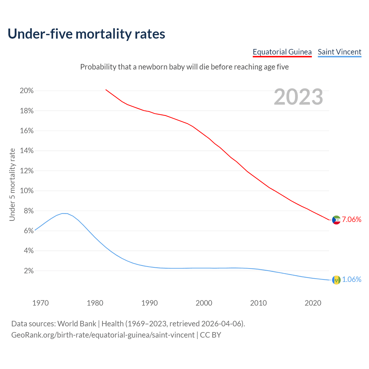 The chance that a newborn baby will die before reaching age five is 7.06% in Equatorial Guinea and 1.06% in Saint Vincent. Above is a chart with historical data on under-five mortality rates.