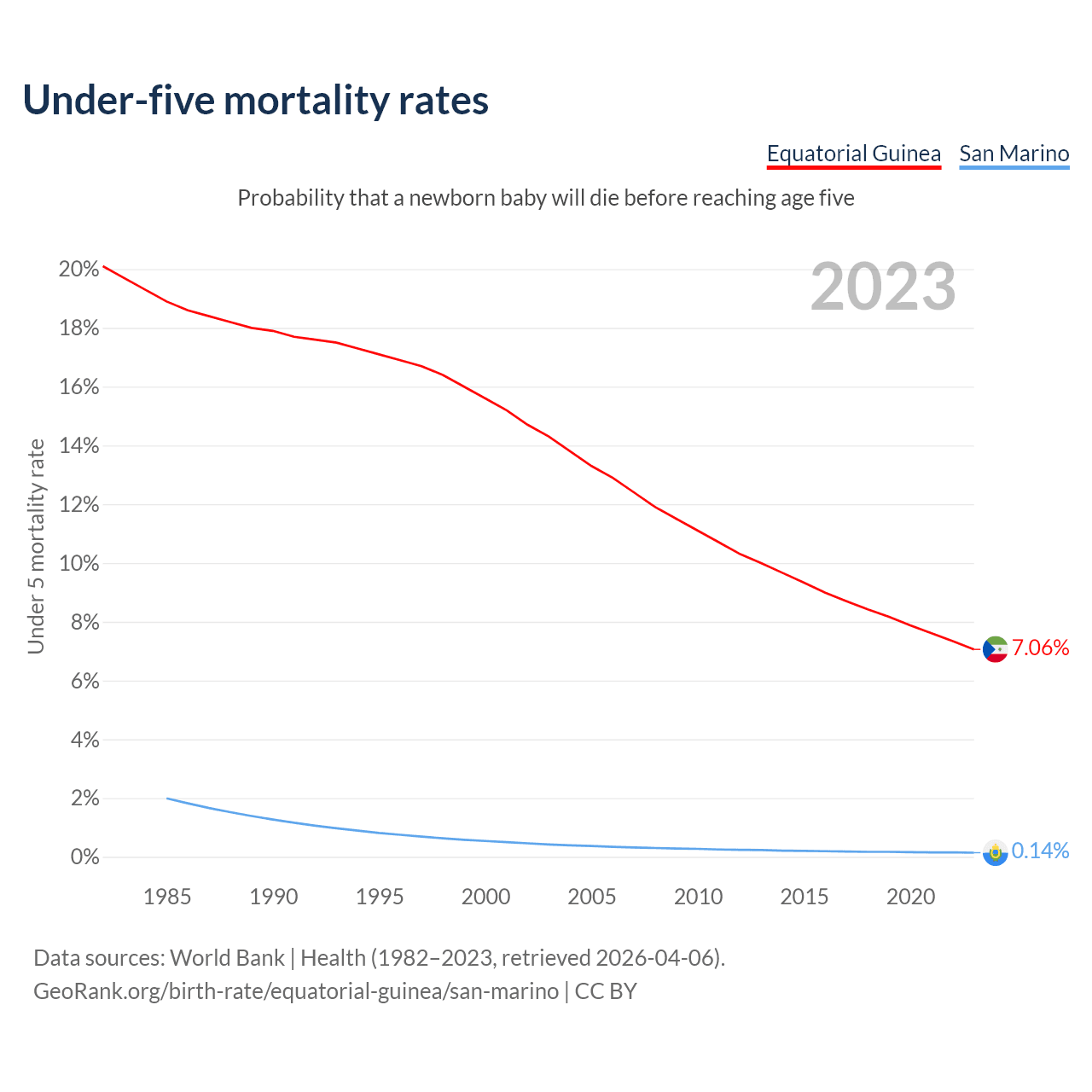 The chance that a newborn baby will die before reaching age five is 7.06% in Equatorial Guinea and 0.14% in San Marino. Above is a chart with historical data on under-five mortality rates.