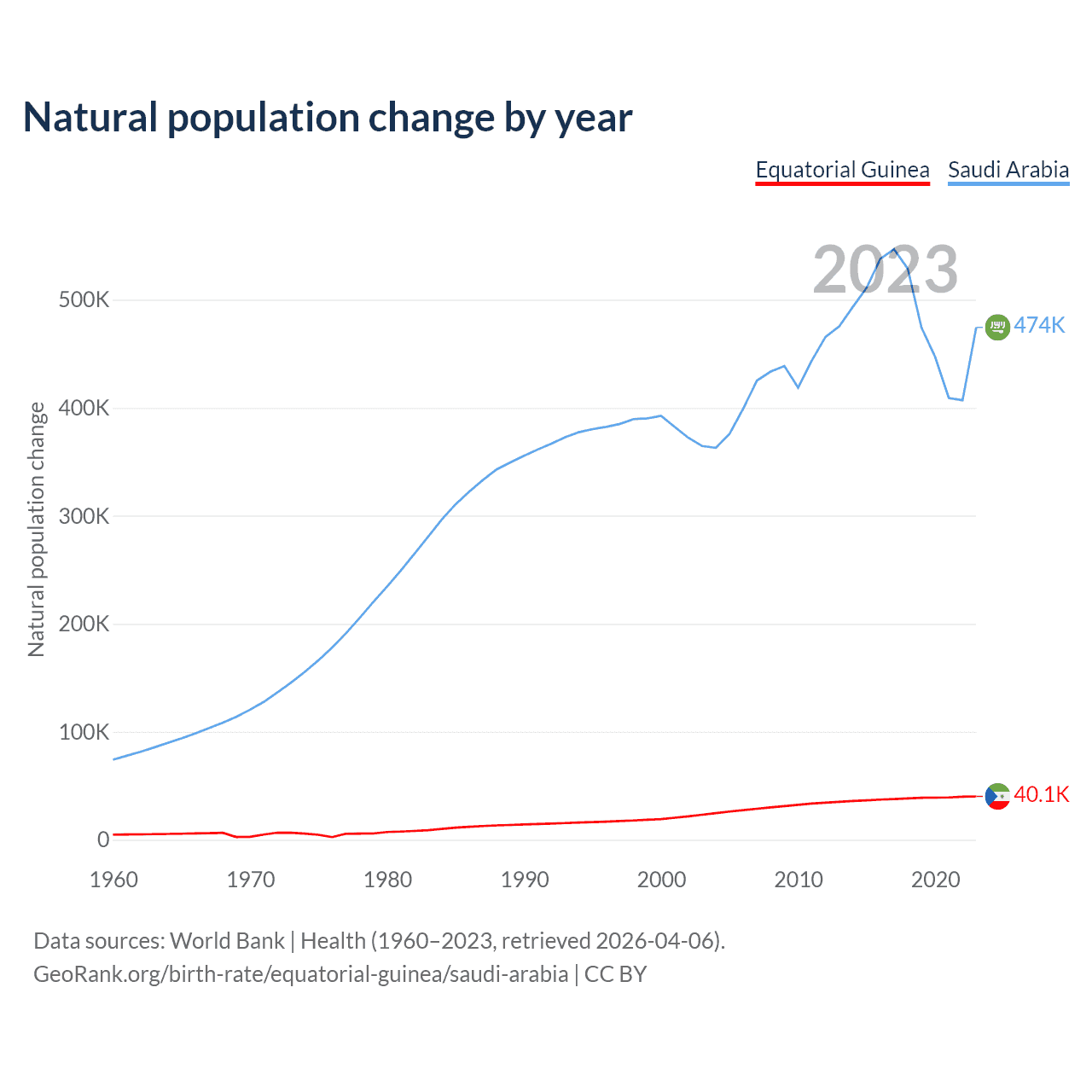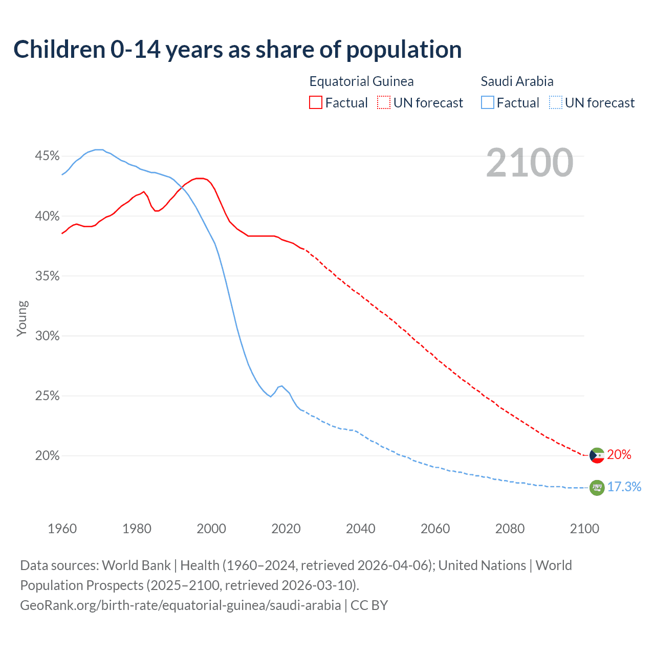 According to the latest available data on birth rates, the fertility rate in Equatorial Guinea was 4.08 children per woman in 2023, compared to 2.28 in Saudi Arabia in 2023. The replacement level is considered to be 2.1 children per woman.