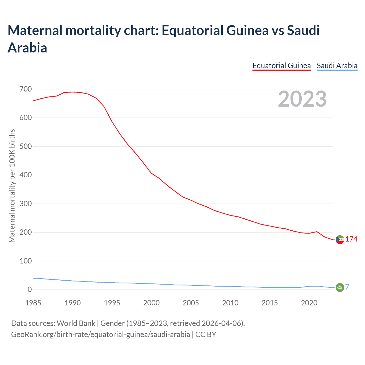 The maternal mortality rate, which is the probability of dying during childbirth or within 42 days of pregnancy termination, is 174 deaths per 100,000 live births in Equatorial Guinea, compared to 7 deaths in Saudi Arabia.