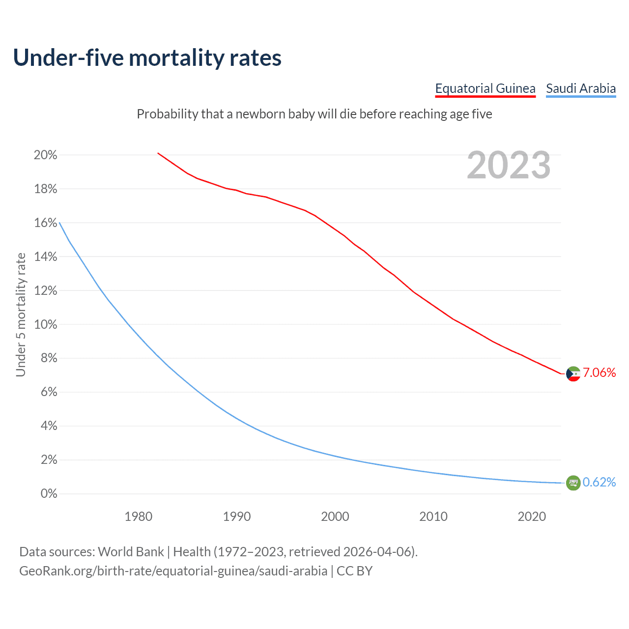 The chance that a newborn baby will die before reaching age five is 7.06% in Equatorial Guinea and 0.62% in Saudi Arabia. Above is a chart with historical data on under-five mortality rates.