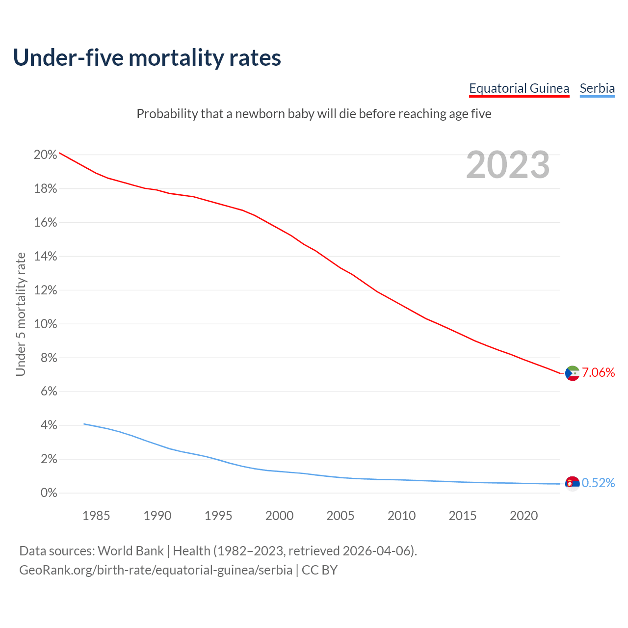 The chance that a newborn baby will die before reaching age five is 7.06% in Equatorial Guinea and 0.52% in Serbia. Above is a chart with historical data on under-five mortality rates.