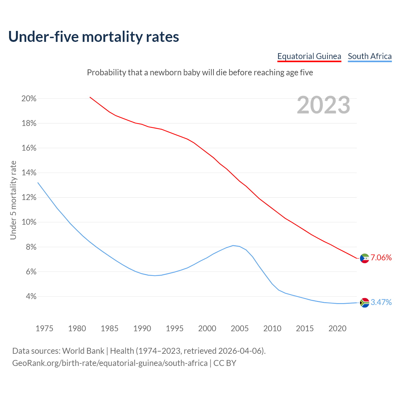 The chance that a newborn baby will die before reaching age five is 7.06% in Equatorial Guinea and 3.47% in South Africa. Above is a chart with historical data on under-five mortality rates.