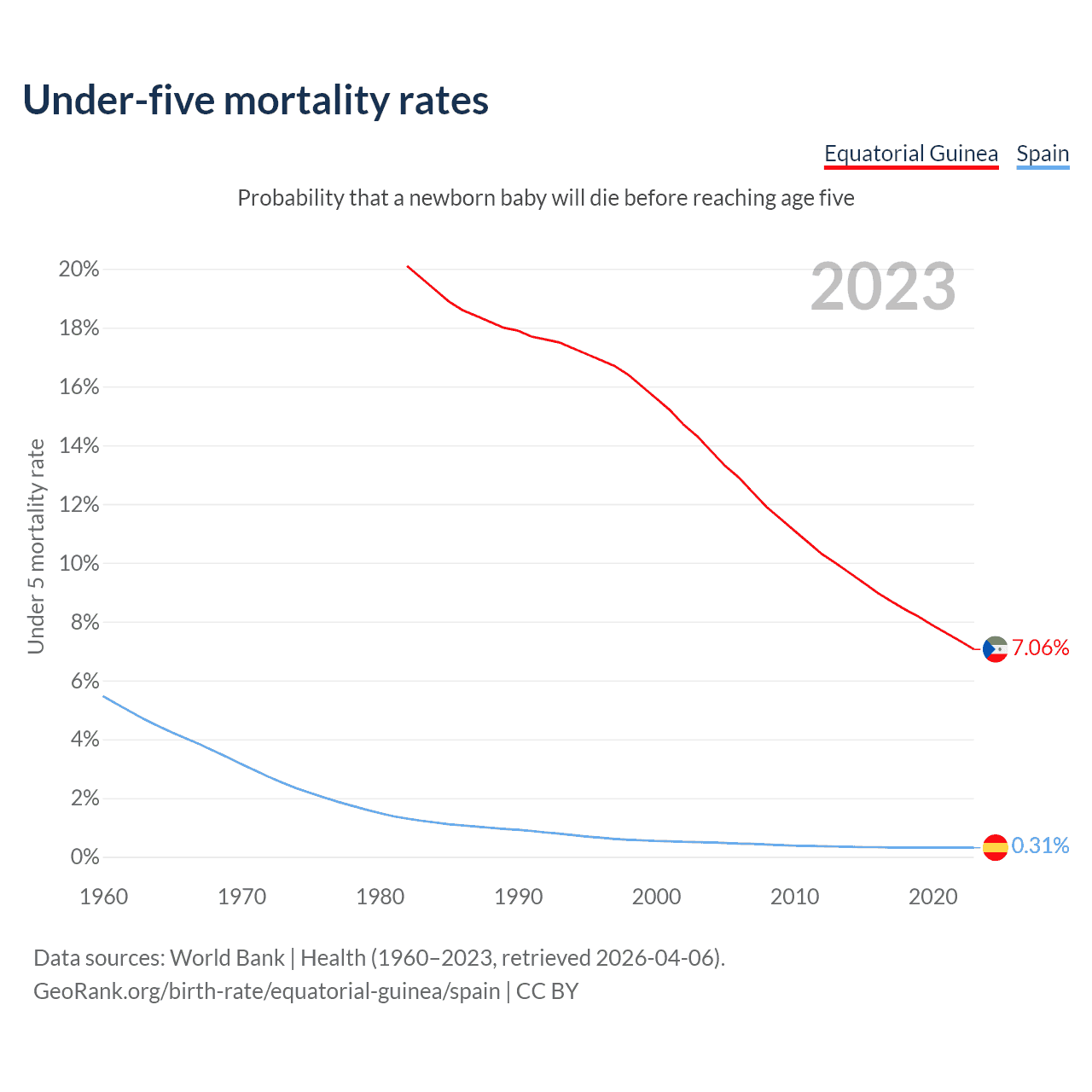 The chance that a newborn baby will die before reaching age five is 7.06% in Equatorial Guinea and 0.31% in Spain. Above is a chart with historical data on under-five mortality rates.