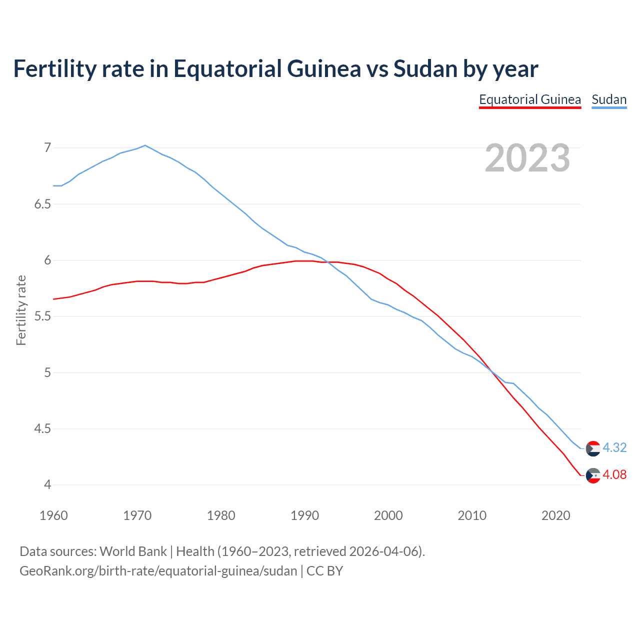 Fertility rate in Equatorial Guinea vs Sudan by year