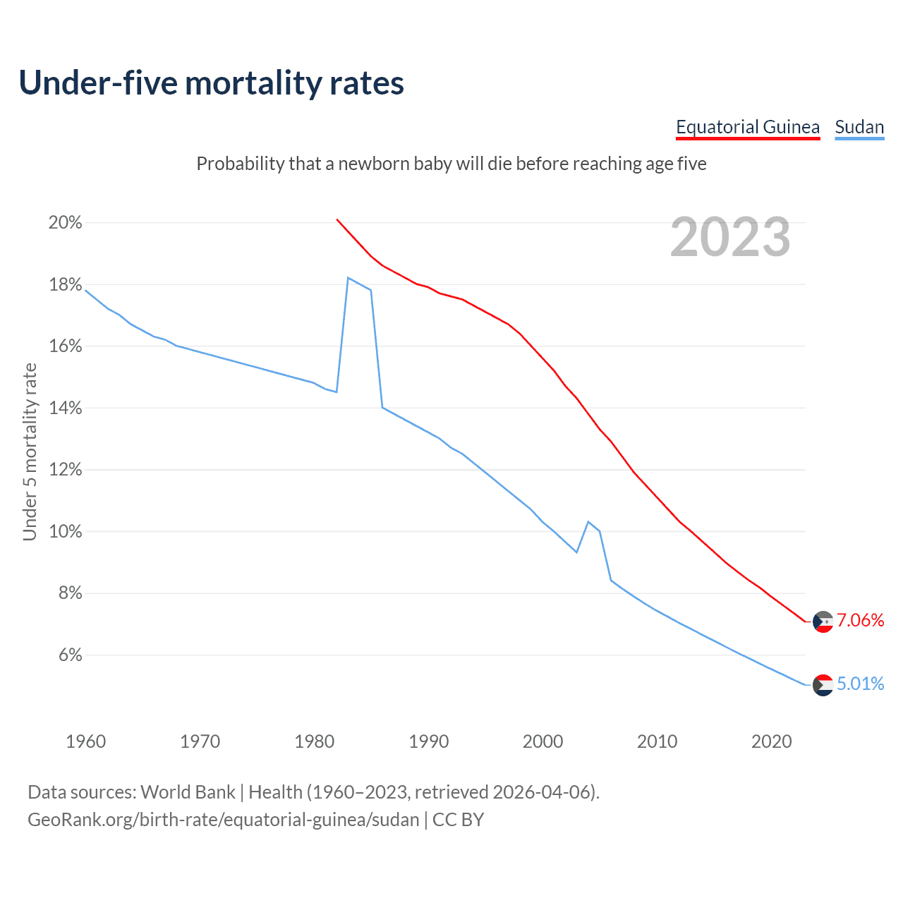 The chance that a newborn baby will die before reaching age five is 7.06% in Equatorial Guinea and 5.01% in Sudan. Above is a chart with historical data on under-five mortality rates.
