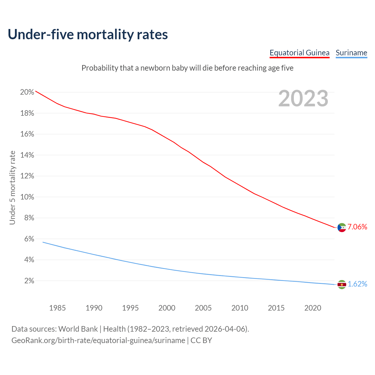 The chance that a newborn baby will die before reaching age five is 7.06% in Equatorial Guinea and 1.62% in Suriname. Above is a chart with historical data on under-five mortality rates.