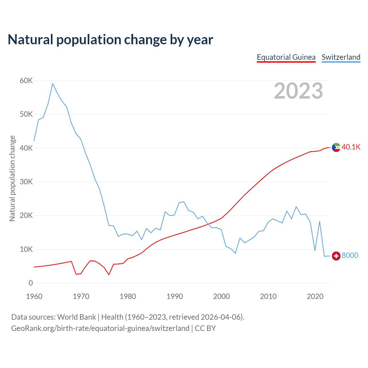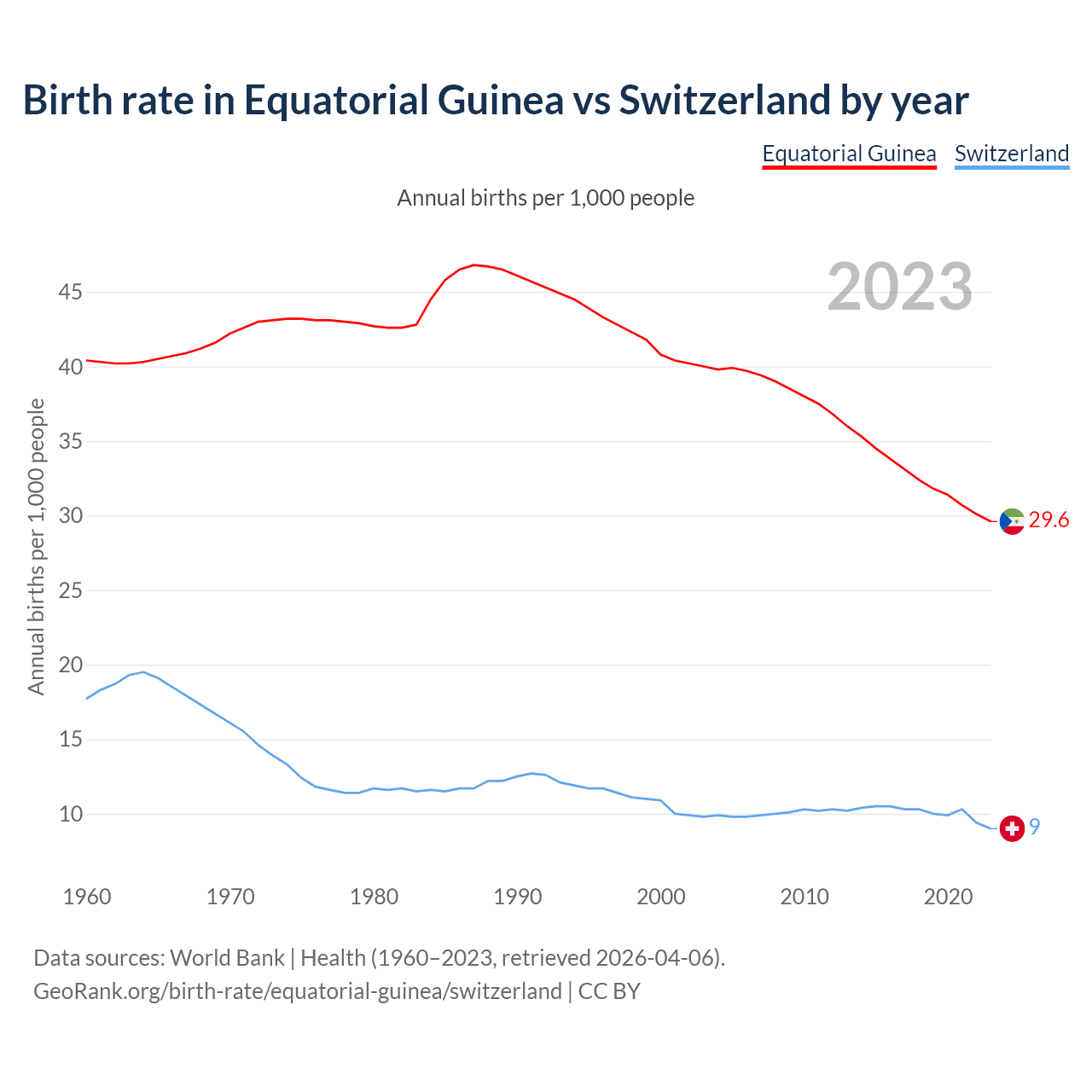 Equatorial Guinea has an annual birth rate of 29.6 births per 1,000 people, compared to 9 for Switzerland. The average number of children a woman is expected to have during her lifetime — the fertility rate, is 4.08 in Equatorial Guinea and 1.33 in Switzerland — 67.4% difference.