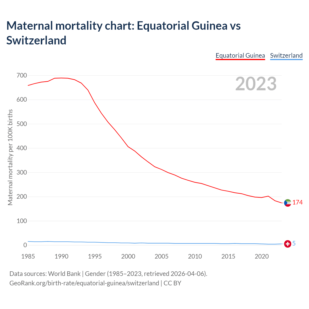 The maternal mortality rate, which is the probability of dying during childbirth or within 42 days of pregnancy termination, is 174 deaths per 100,000 live births in Equatorial Guinea, compared to 5 deaths in Switzerland.
