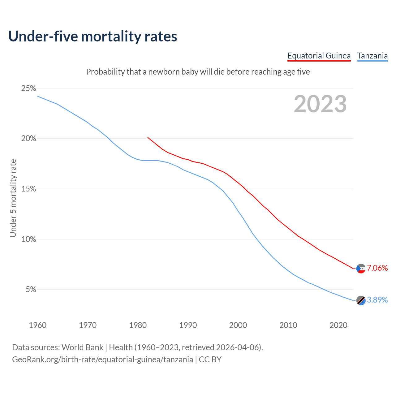 The chance that a newborn baby will die before reaching age five is 7.06% in Equatorial Guinea and 3.89% in Tanzania. Above is a chart with historical data on under-five mortality rates.