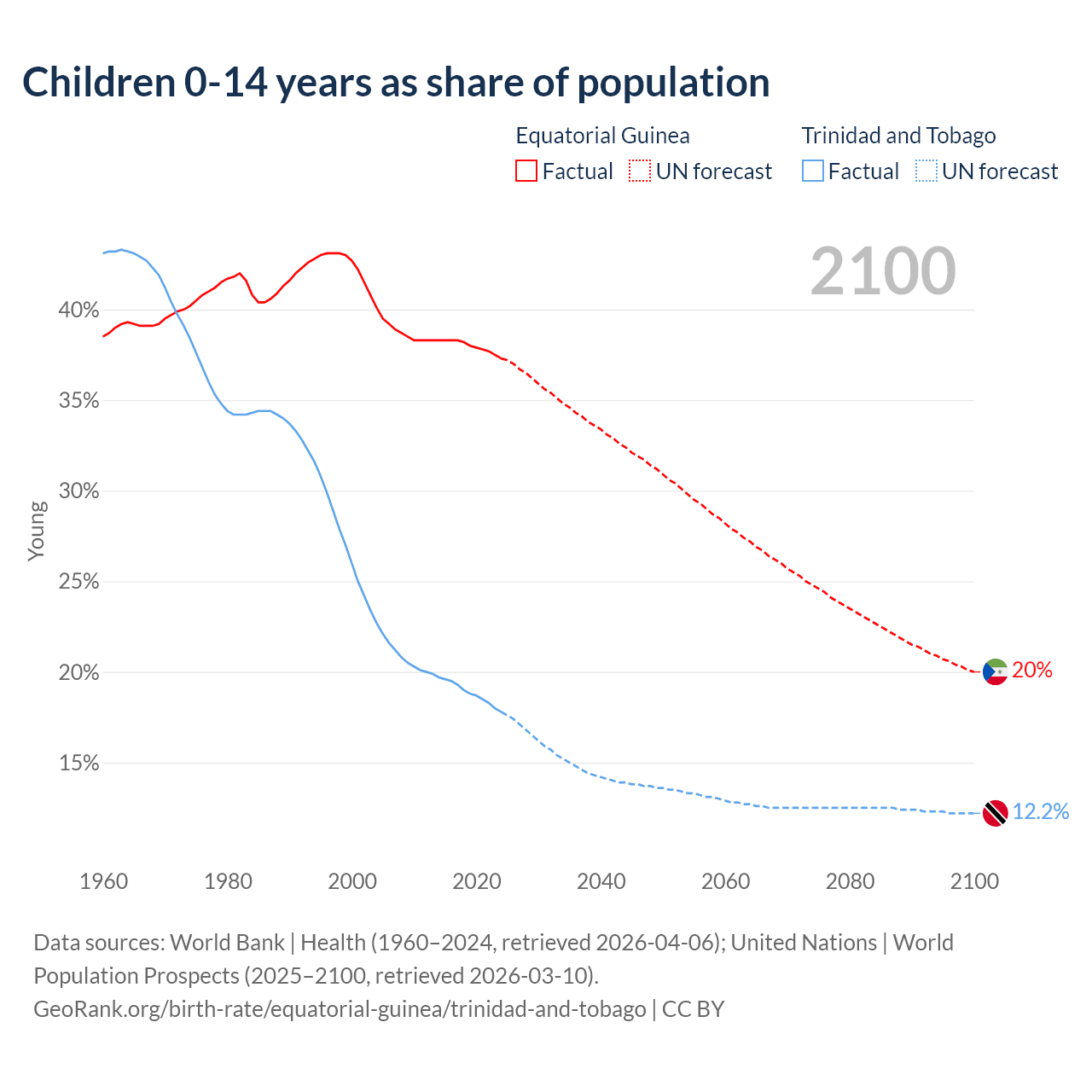 According to the latest available data on birth rates, the fertility rate in Equatorial Guinea was 4.08 children per woman in 2023, compared to 1.53 in Trinidad and Tobago in 2023. The replacement level is considered to be 2.1 children per woman.