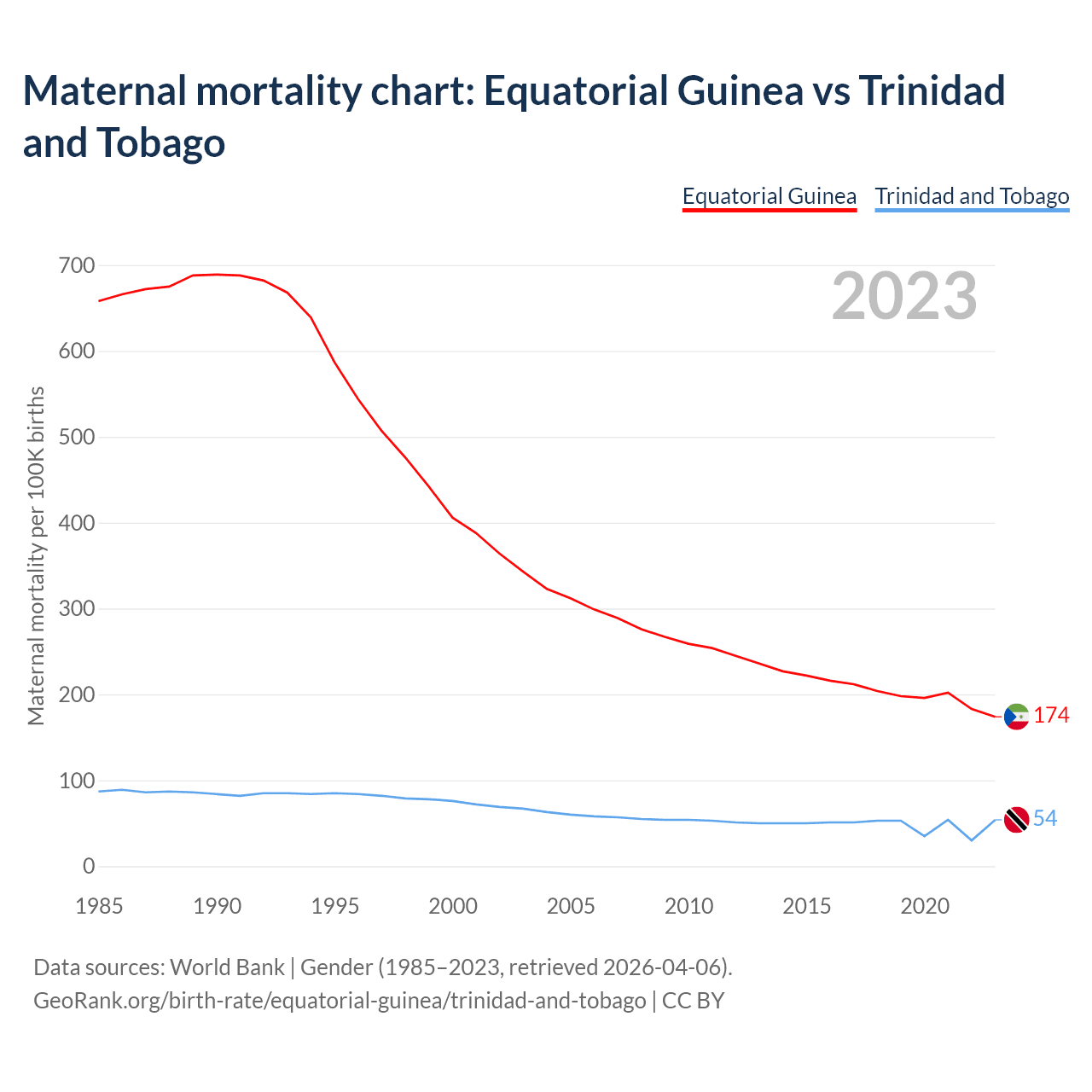 The maternal mortality rate, which is the probability of dying during childbirth or within 42 days of pregnancy termination, is 174 deaths per 100,000 live births in Equatorial Guinea, compared to 54 deaths in Trinidad and Tobago.