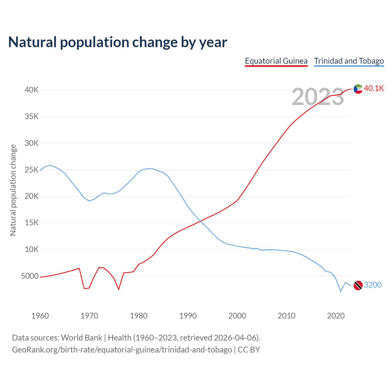 Equatorial Guinea has an annual birth rate of 29.6 births per 1,000 people, compared to 10.7 for Trinidad and Tobago. The average number of children a woman is expected to have during her lifetime — the fertility rate, is 4.08 in Equatorial Guinea and 1.53 in Trinidad and Tobago — 62.5% difference.