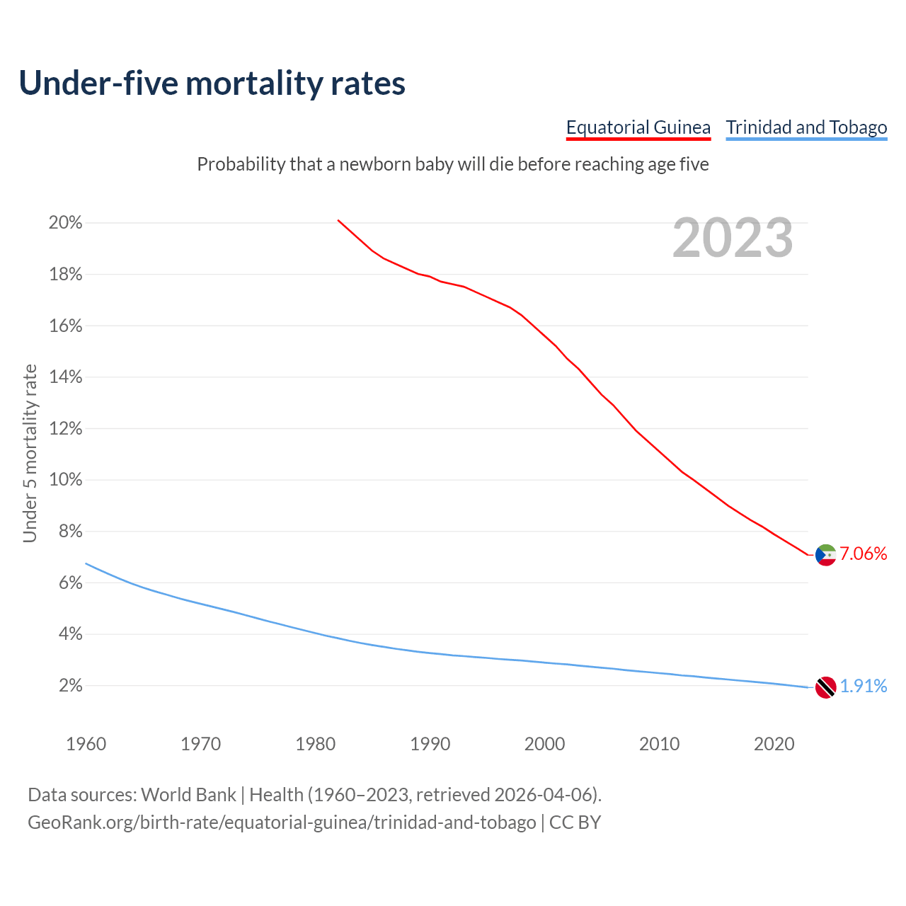The chance that a newborn baby will die before reaching age five is 7.06% in Equatorial Guinea and 1.91% in Trinidad and Tobago. Above is a chart with historical data on under-five mortality rates.
